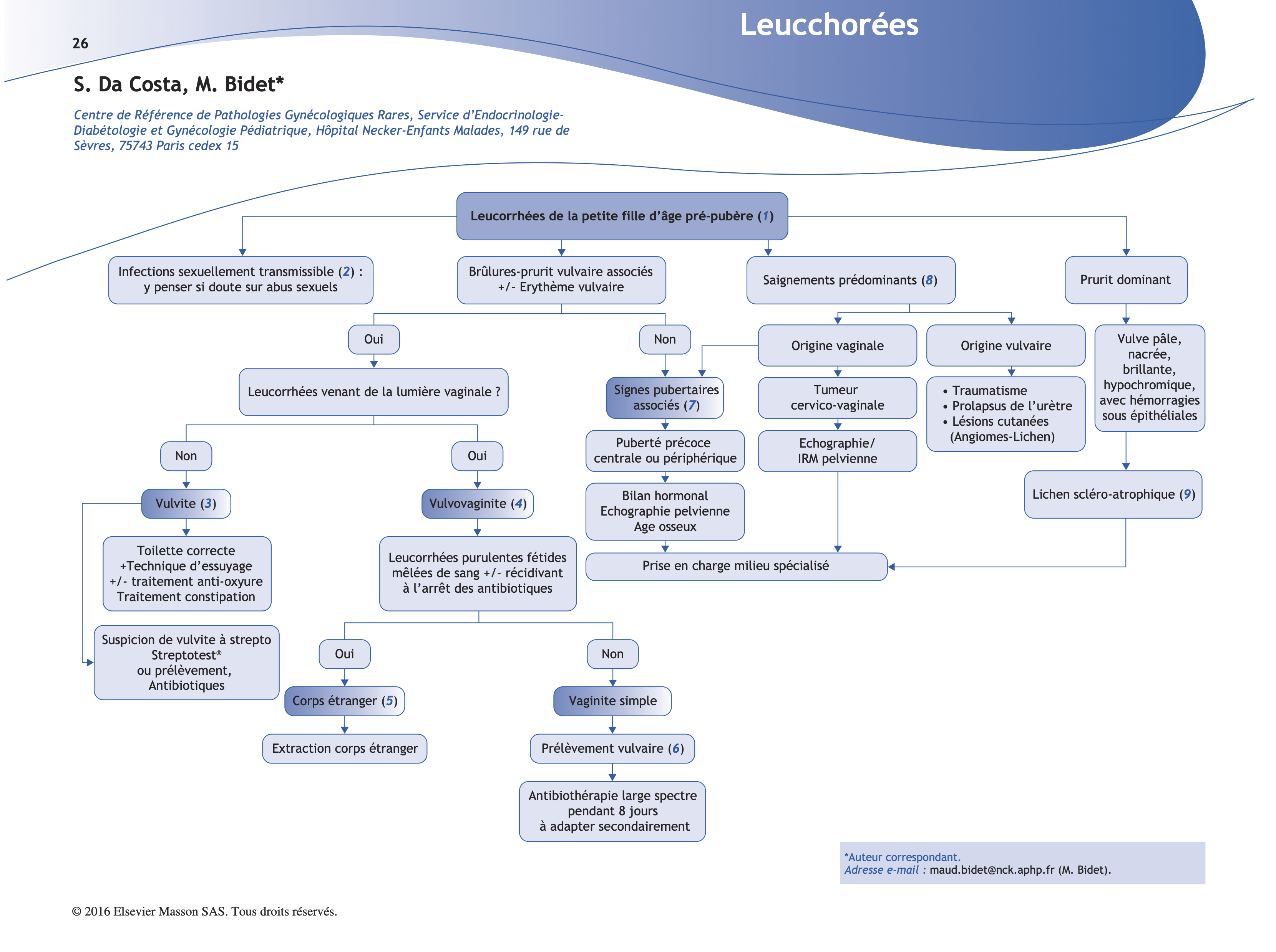 (1) Les étiologies des leucorrhées chez les filles non pubères, sont peu nombreuses ; le plus souvent leur diagnostic repose sur un interrogatoire et un examen clinique précis sans qu’il soit nécessaire de recourir à des examens complémentaires.