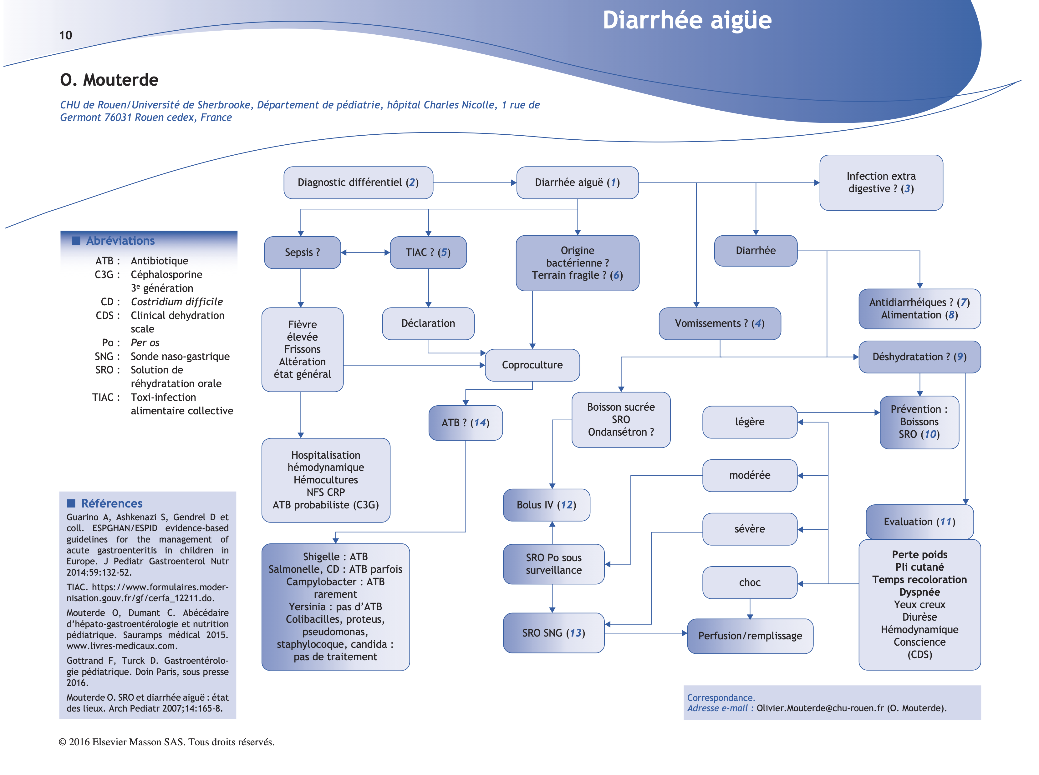 (1) La diarrhée aigüe est une pathologie fréquente, source de nombreuses consultations et hospitalisations. L’étiologie est le plus souvent virale, avec le rotavirus au premier plan chez le nourrisson et le jeune enfant. Elle est définie comme une modification brutale du transit, avec des selles molles ou liquides. Cette définition peut être prise en défaut lors de certains épisodes où coexistent hypersécrétion et troubles de motricité, le tableau initial étant alors un troisième secteur avec une hypovolémie associée à un abdomen volumineux et gargouillant.