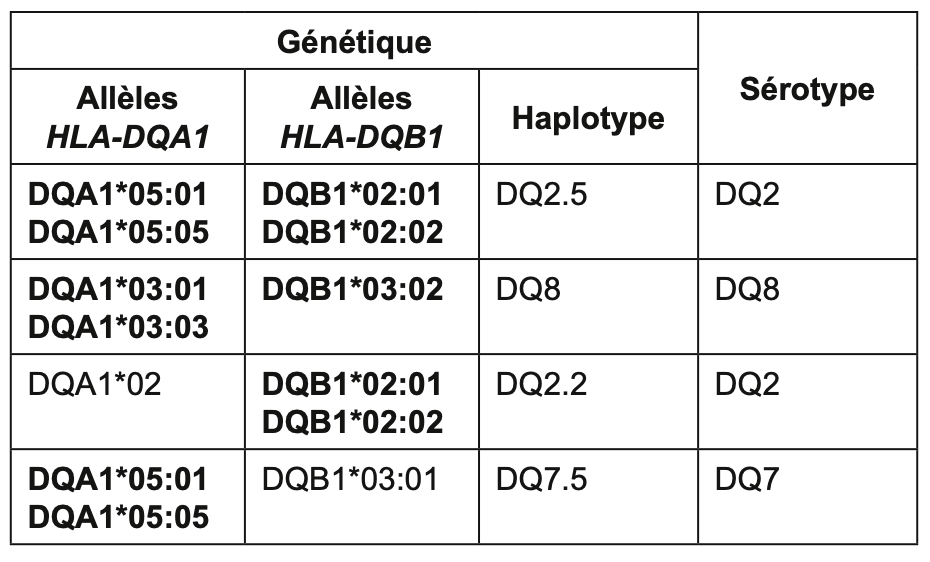 Le HLA (Human Leukocyte Antigen) est le complexe majeur d’histocompatibilité (CMH) chez l’homme. Le HLA-DQ est un récepteur de surface des cellules présentatrices d’antigènes. Il s’agit d’un hétérodimère (chaîne alpha et bêta) de type CMH de classe II. La chaîne alpha DQ est codée par le gène HLA-DQA1 et la chaîne bêta est codée par le gène HLA-DQB1. Les différents sérotypes de HLA-DQ correspondent essentiellement à la chaîne DQB1. Un sérotype peut correspondre à plusieurs allèles. La table ci-dessous donne la correspondance entre le génotype et le sérotype pour les allèles à risque. Les sérotypes DQ2 à risque de maladie coeliaque correspondent aux haplotypes DQ2.5 (essentiellement) et DQ2.2, l’haplotype DQ2.3 n’étant pas à risque.