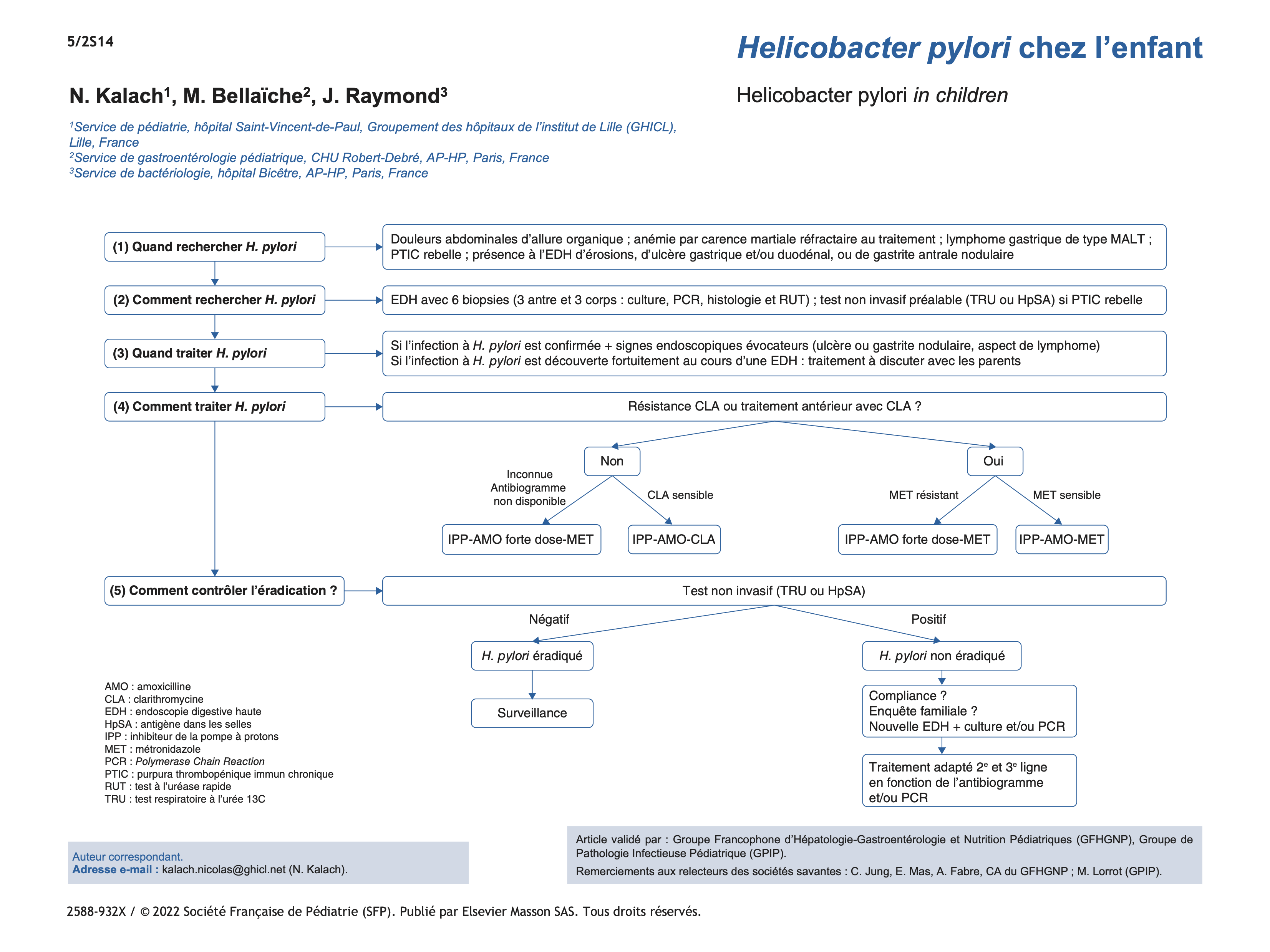 L’infection à Helicobacter pylori chez l’enfant diffère de celle de l’adulte tant du point de vue épidémiologique, que de la réponse de l’hôte, des caractéristiques cliniques, des stratégies diag nostiques et thérapeutiques. Les douleurs abdominales récurrentes ne sont pas spécifiques de l’infection à H. pylori chez l’enfant, et le plus souvent, l’infection est asymptomatique. Le diagnostic initial repose sur l’endoscopie digestive haute avec réalisation de biopsies (culture, PCR, histologie, RUT). Chez l’enfant, l’utilisation systématique d’un traitement adapté au profil de l’antibiogramme ou aux résultats de la PCR avec une compliance thérapeutique supérieure à 90 % améliore significativement le taux d’éradication bactérienne. Enfin, les dernières directives pédiatriques recommandent une durée de traitement de 14 jours pour la trithérapie.