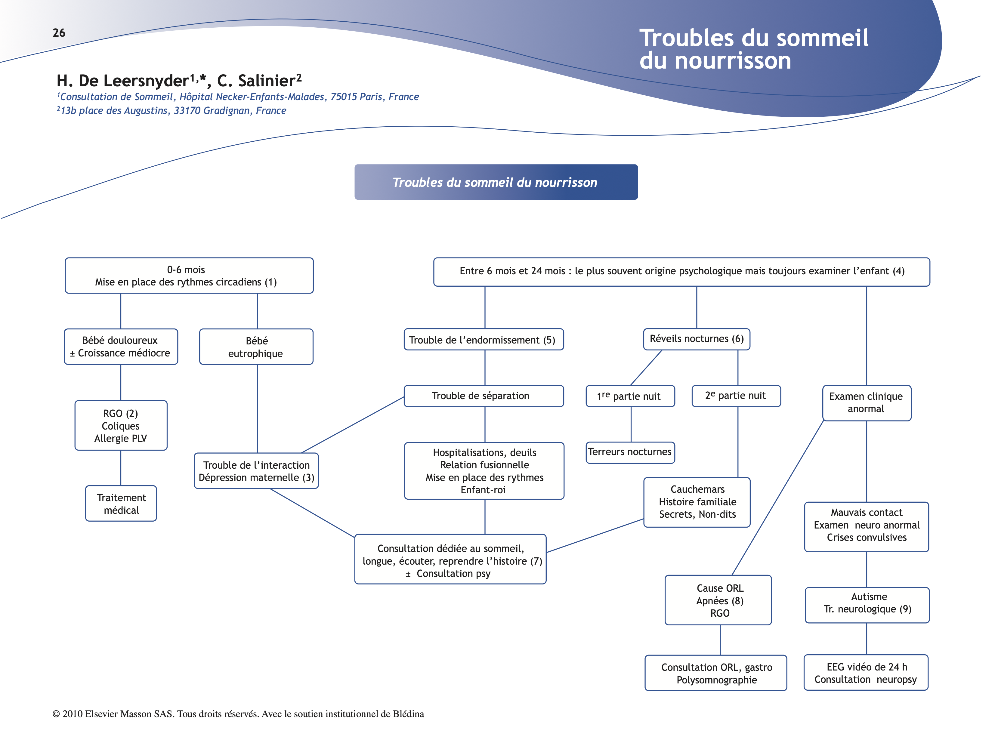 (7) Toutes ces situations justifient une consultation longue, dédiée au sommeil. Le médecin reprendra, par l’interrogatoire, les circonstances de la grossesse, de l’accouchement, des premiers mois de vie, puis questionnera les parents sur les deuils, l’histoire même de l’enfance des parents, les traumatismes familiaux. L’enfant n’a, le plus souvent, pas de problème psychologique, mais les troubles du sommeil viennent révéler les difficultés de la parentalité pour des parents parfois dans une souffrance ancienne. Le traitement médicamenteux est inutile, une aide psychologique est souvent nécessaire.