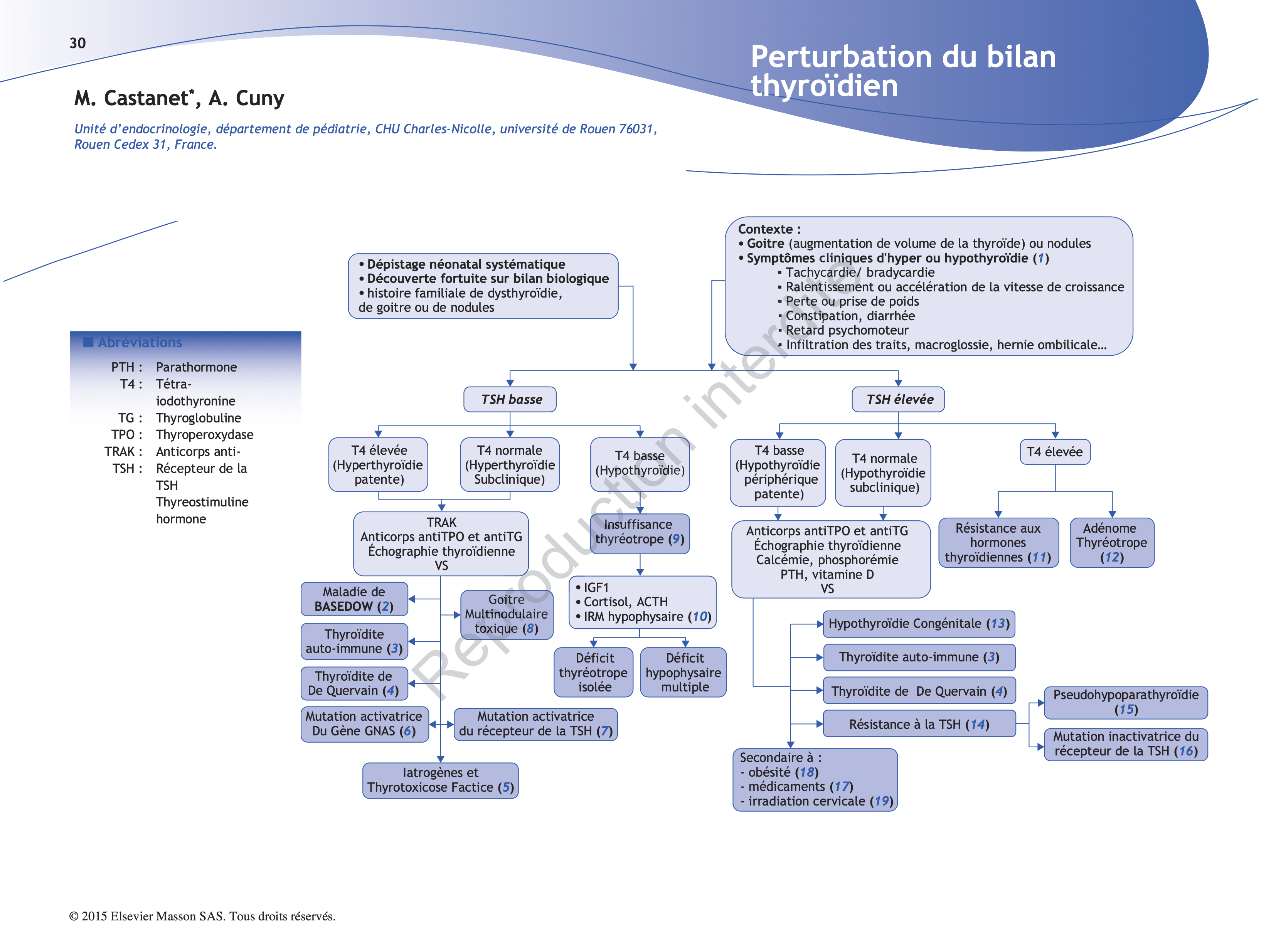 (14) Le diagnostic de résistance à la TSH est suspecté devant une hypothyroïdie périphérique (T4 basse, TSH élevée) sans goitre palpable (possibilité d’augmentation très modérée de la taille de la glande thyroïdienne). Dans ce cas, les anticorps anti-TPO et anti-TG sont négatifs et l’échographie thyroïdienne est normale.