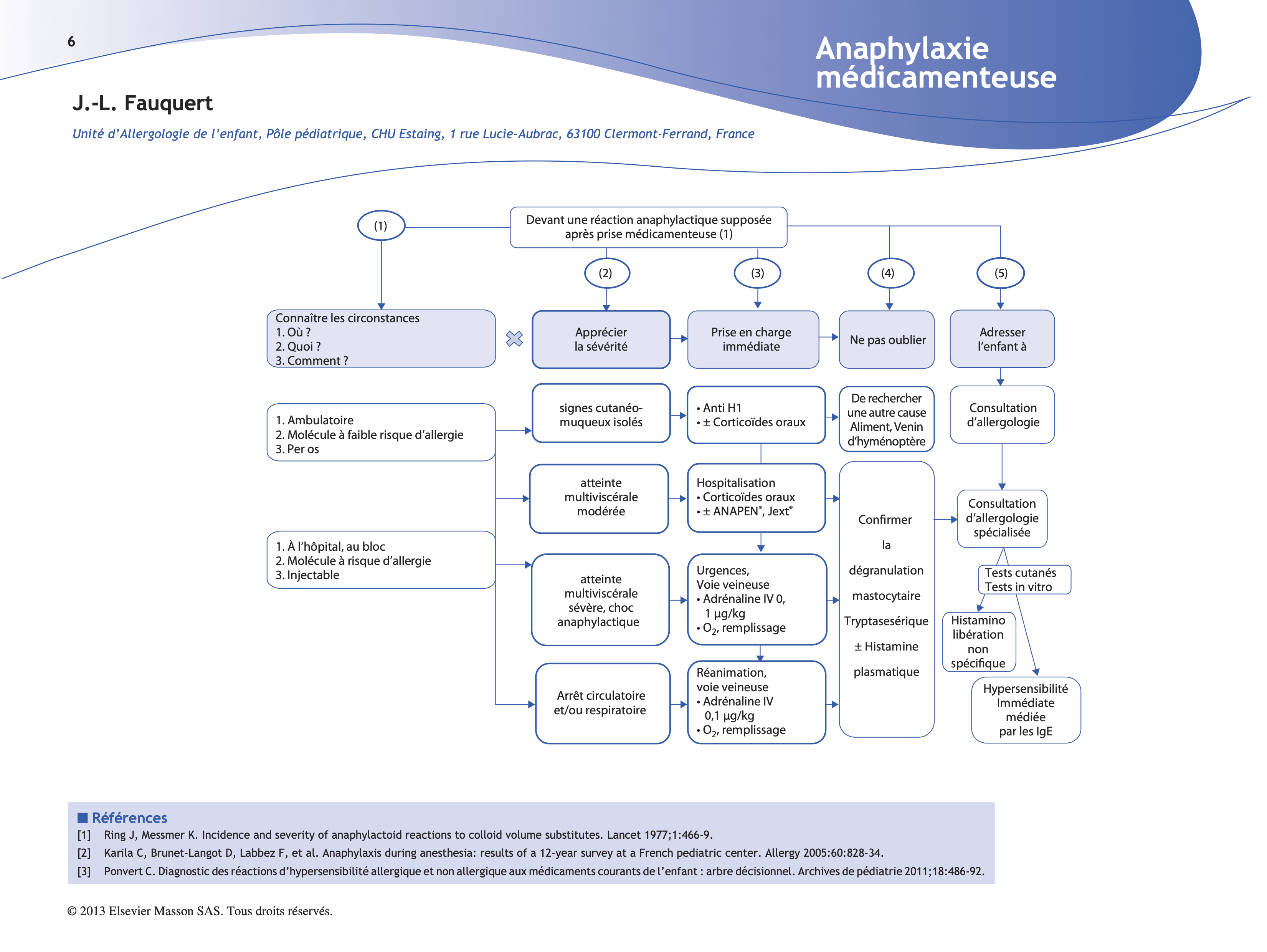 (1) L’anaphylaxie médicamenteuse est une réaction d’hypersensibilité immédiate, consécutive à l’administration d’un médicament, susceptible d’engager le pronostic vital. Elle est habituellement allergique et médiée par les IgE, mais peut être non allergique, par action directe d’une substance médicamenteuse sur le mastocyte. Elle survient surtout en milieu hospitalier, où les traitements par voie veineuse sont responsables des formes les plus sévères, en particulier au bloc opératoire. Les formes ambulatoires sont possibles en particulier avec les traitements anti-inflammatoires.