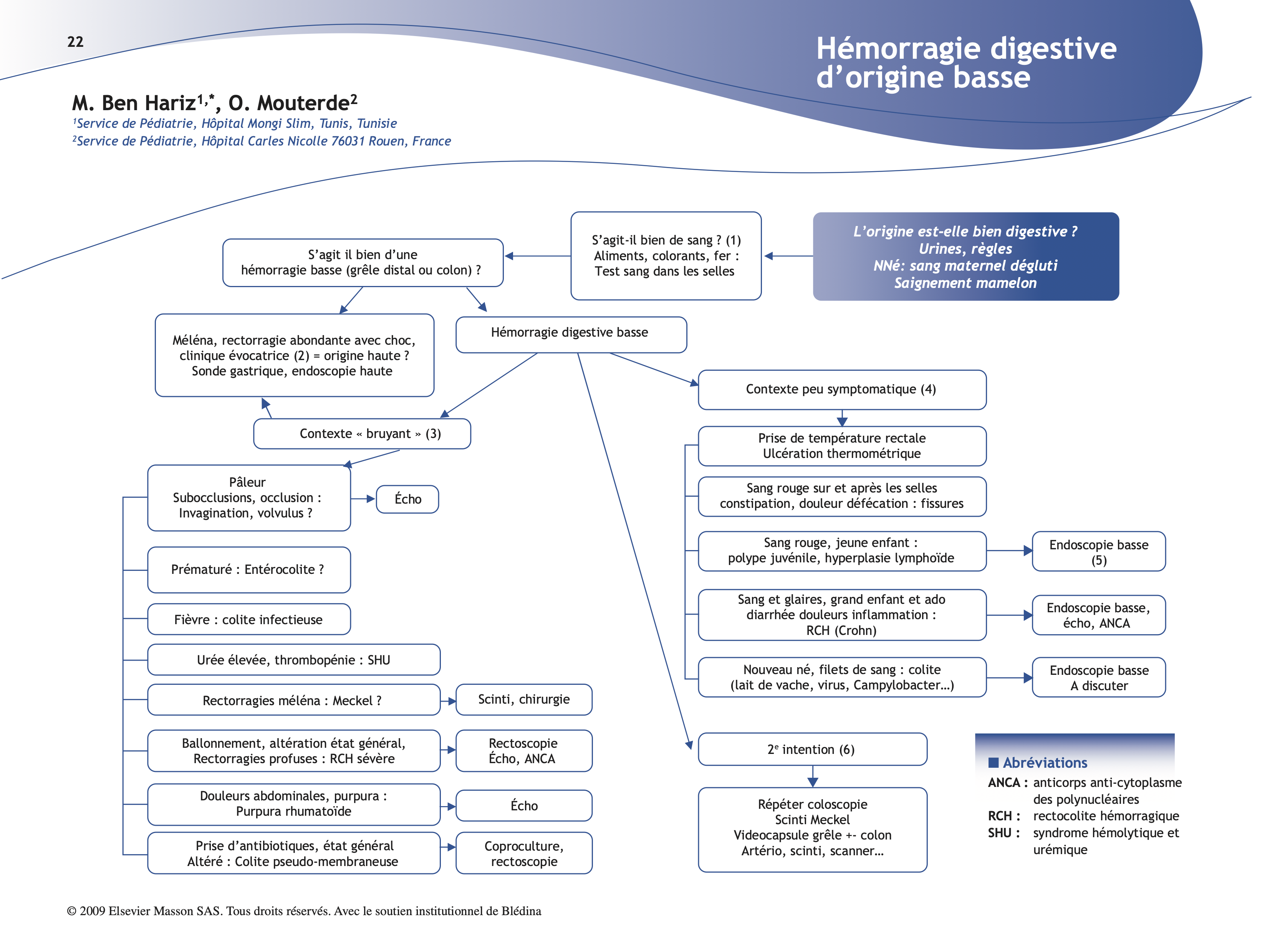 (3) Le contexte, l’interrogatoire et l’examen clinique permettent souvent de suspecter la cause du saignement : purpura rhumatoïde, invagination intestinale aiguë, entérocolite ulcéronécrosante, maladie inflammatoires du tube digestif sévère (des rectorragies abondantes évoquent plus une RCH qu’une maladie de Crohn)…