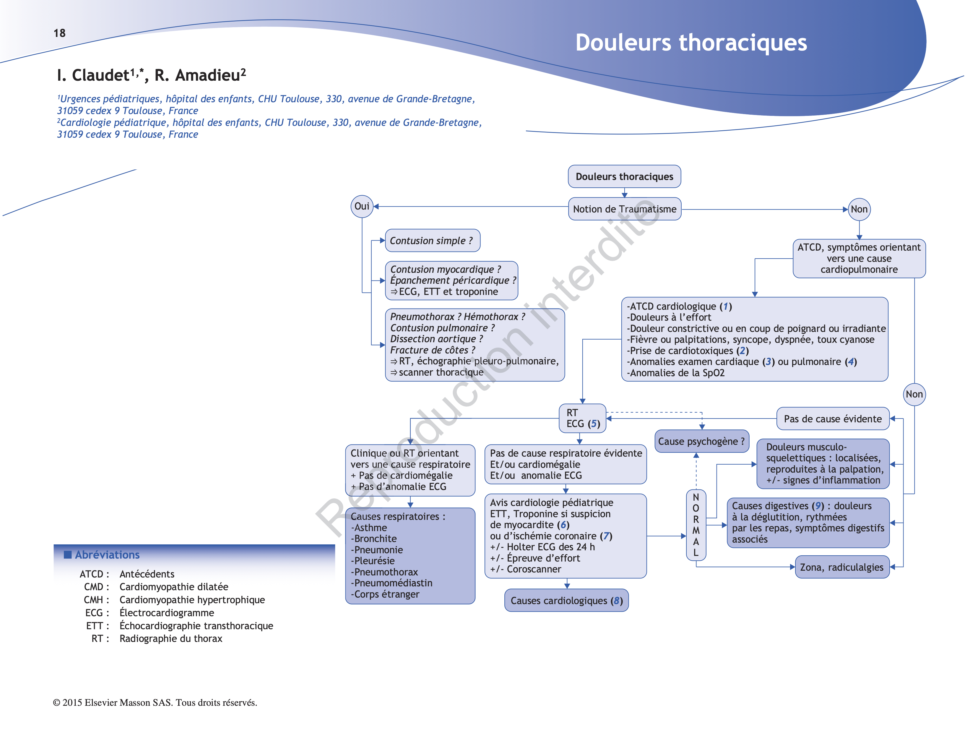 (8) Causes cardiologiques : péricardite, myocardite, CMD, CMH, sténoses aortiques, anomalies congénitales des coronaires, sténose coronaire compliquant une maladie de Kawasaki, sténose ostiale coronaire après réimplantation chirurgicale des coronaires (TGV, Ross...), coronaropathie du greffon, sténose coronaire sur hypercholestérolémie familiale homozygote, arythmies, dissection aortique, hypertension pulmonaire, cardiotoxiques (2), embolie pulmonaire. Les causes cardiologiques sont en pratique rares.