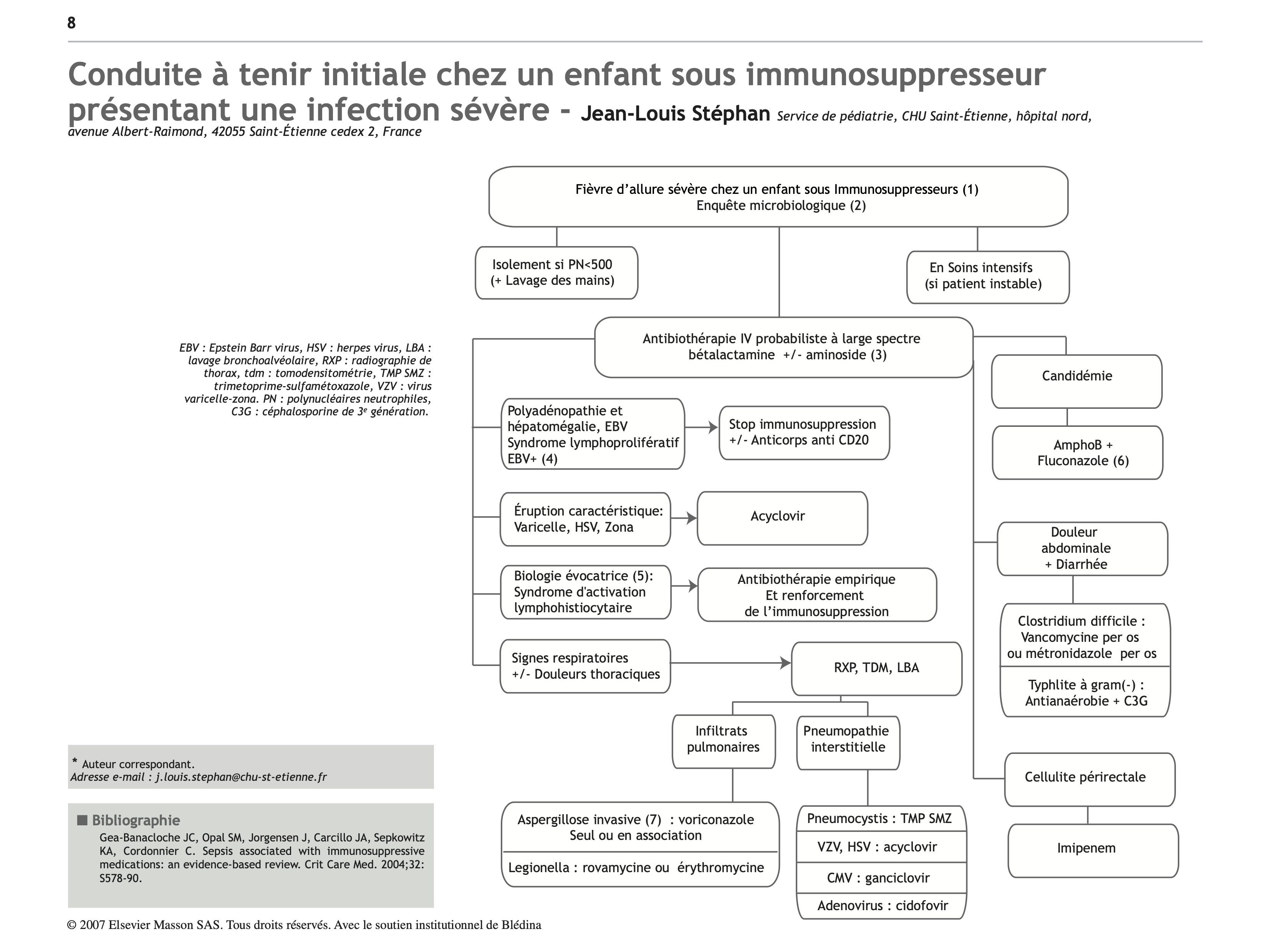 Arbre décisionnel - Commentaires(1) Véritable urgence thérapeutique qui recouvre en fait des situations très variées : le risque de sepsis grave est d’autant plus important que l’enfant est neutropénique (cytotoxiques, auto-immunité, reconstitution laborieuse d’une greffe de cellules souches) – ce qui justifiera son isolement – qu’il présente une asplénie (splénectomie pour cytopénie auto-immune, fonctionnelle : lupus), une lymphopénie profonde (corticoïdes au long cours, GVH). L’antibiothérapie guidée par un choix empirique doit être très rapidement proposée, après un examen clinique soigneux à la recherche d’une porte d’entrée (mucite, troubles digestifs, lésions périnéales ou cutanées, toux) et l’obtention en urgence d’un minimum d’examens complémentaires qui ne doivent pas la retarder.