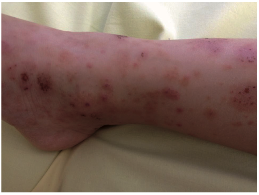 Figure 2. Éruption purpurique vasculaire avec éléments nécrotiques (infiltrés, croûteux). (photo fournie par A. Lefèvre-Utile)