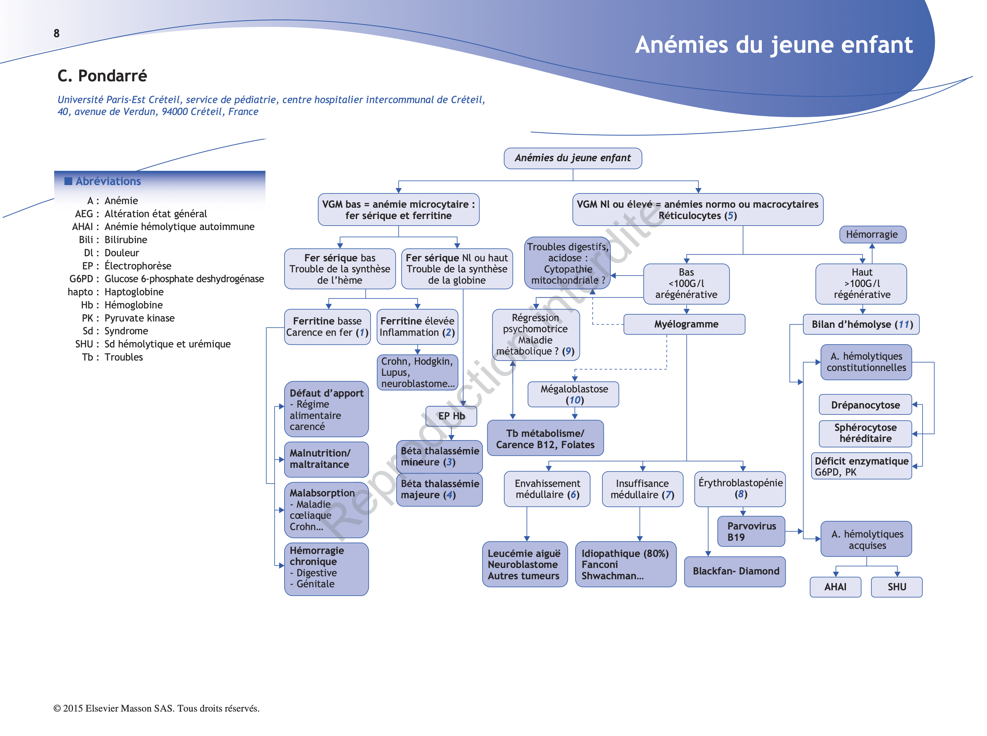 (7) Toute anémie non régénérative, même modérée et isolée, lorsqu’elle est associée à des anomalies extra-hématologiques (endocriniennes, retard staturo-pondéral, RCIU, ou sd malformatif, troubles des apprentissages), doit conduire à un avis précoce en hématologie pédiatrique. Il peut effectivement s’agir d’une maladie constitutionnelle grave (anémie de Fanconi), et le diagnostic précis de la maladie peut alors conduire à un conseil génétique.