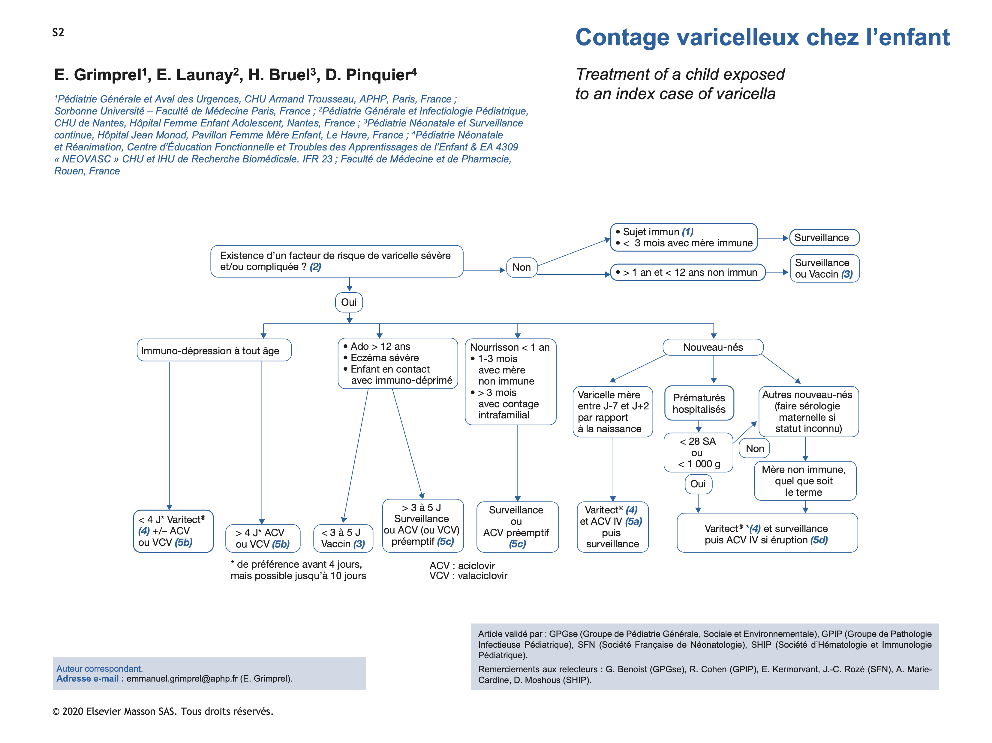 (5a) L’aciclovir par voie intraveineuse (20 mg/kg/8 h pendant 5 à 7 jours) est recommandé (AMM) dès que possible chez le nouveau-né dont la mère a déclaré une varicelle entre 5 jours avant et 2 jours après l’accouchement. En dehors de cette situation, il n’existe ni AMM ni recommandation officielle pour l’utilisation de l’aciclovir en prophylaxie de la varicelle. Les autres indications de l’aciclovir sont en effet limitées en pédiatrie au traitement curatif intraveineux des varicelles survenant chez l’immunodéprimé et chez le nouveau-né ainsi qu’aux cas de varicelle grave et/ou compliquée.