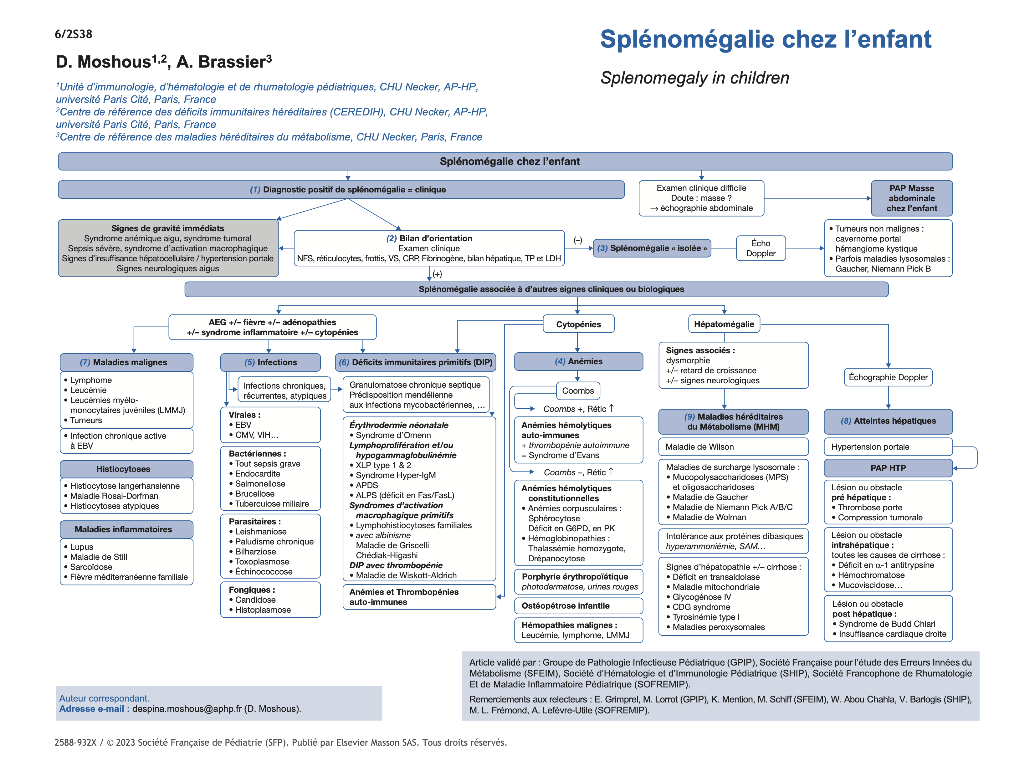 (6) Devant une SM avec fièvre, AEG, adénopathies, +/- cytopénies, il faut penser à certains déficits immunitaires primitifs (DIP). Leur exploration nécessite un bilan de deuxième intention (dosage pondéral des immunoglobulines, numération des populations lymphocytaires T, B, NK) et un avis spécialisé pour orienter le bilan étiologique (485 formes génétiques ont été décrites dans la dernière classification internationale de DIP en 2022 !) et la prise en charge des patients.