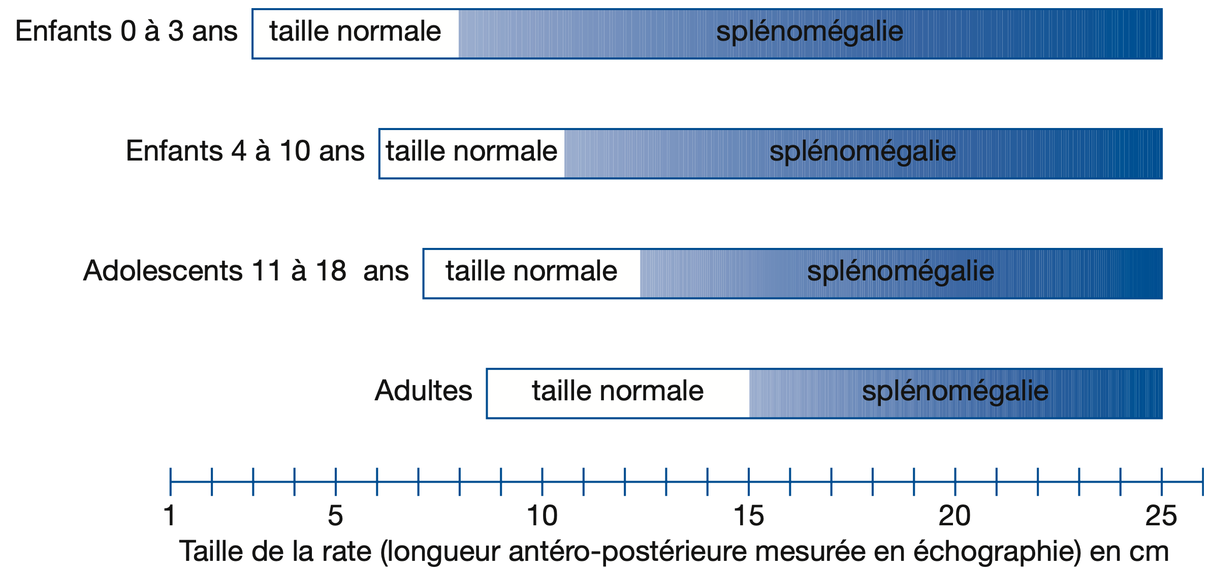 Située dans la partie supérieure gauche de la cavité abdominale, entre le fundus gastrique et le diaphragme, à proximité du bord costal entre les neuvième et onzième côtes, la rate n’est en règle pas palpable. La splénomégalie (SM) est définie comme une augmentation du volume de la rate qui devient palpable à l’examen clinique. La présence d’une SM doit faire rechercher sa cause.