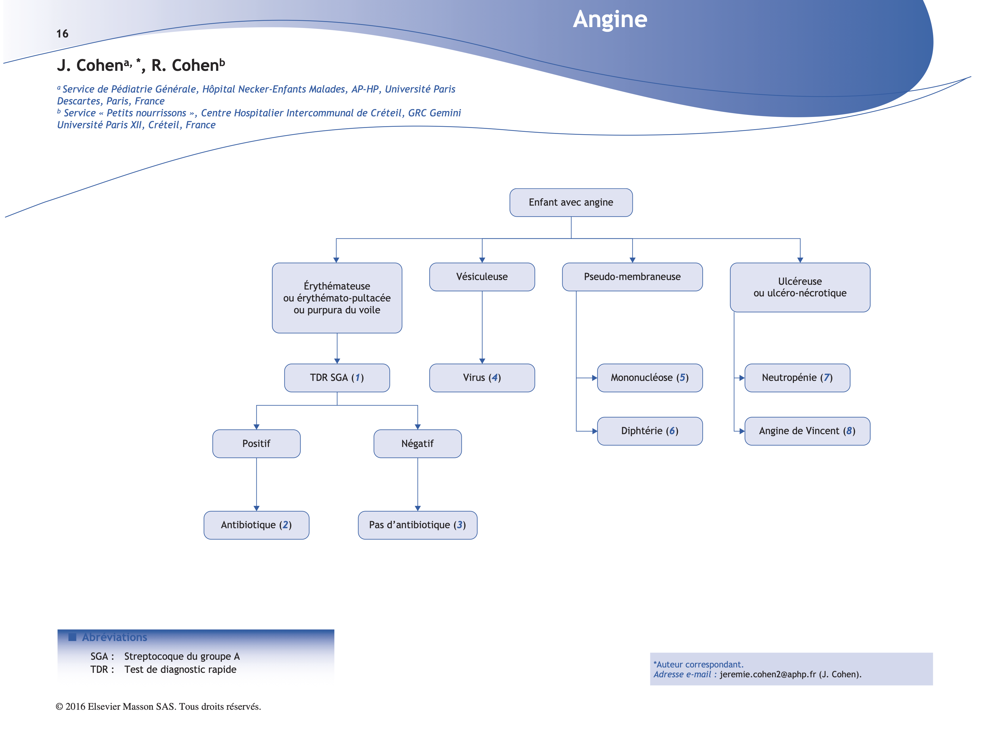(1) L’angine est une inflammation d’origine infectieuse des amygdales voire de l’ensemble du pharynx. Elle constitue un syndrome qui associe de façon variable une fièvre, une gêne douloureuse à la déglutition (odynophagie) et des modifications de l’aspect de l’oropharynx. Chez les enfants entre 3 et 15 ans, le test de diagnostic rapide (TDR) pour le streptocoque du groupe A (SGA) doit être réalisé de manière systématique en cas d’angine érythémateuse, érythémato-pultacée ou s’accompagnant d’un purpura du voile car l’examen clinique ne permet pas d’écarter ni d’affirmer l’origine streptococcique de l’angine. Avant l’âge de 3 ans, le SGA est rare et les complications post-streptococciques sont exceptionnelles. A partir de 15 ans, on applique les recommandations de l’adulte.