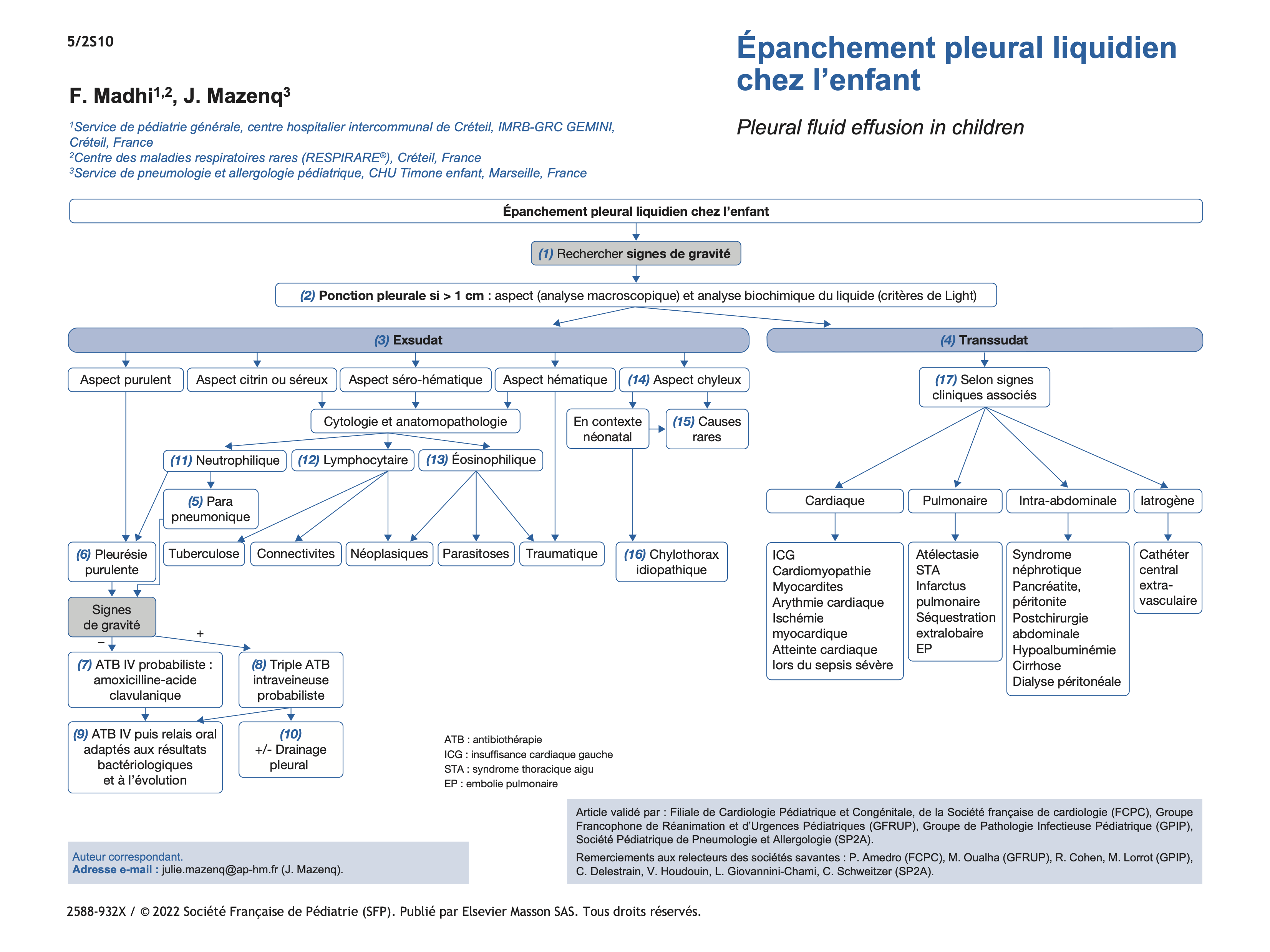 (1) Les situations de gravité sont à rechercher et à prendre en charge en priorité : infectieuses (traitements symptomatiques ciblés et modification de l’antibiothérapie probabiliste) = signes toxiniques, choc septique, leucopénie, hémoptysie ; respiratoires (discussion d’un drainage ou de thoracoscopie) = insuffisance respiratoire aiguë (signes de luttes marqués, hypoxémie, signes d’hypercapnie, etc.), déviation trachéale secondaire à un épanchement massif, douleur thoracique non contrôlée par antalgie.