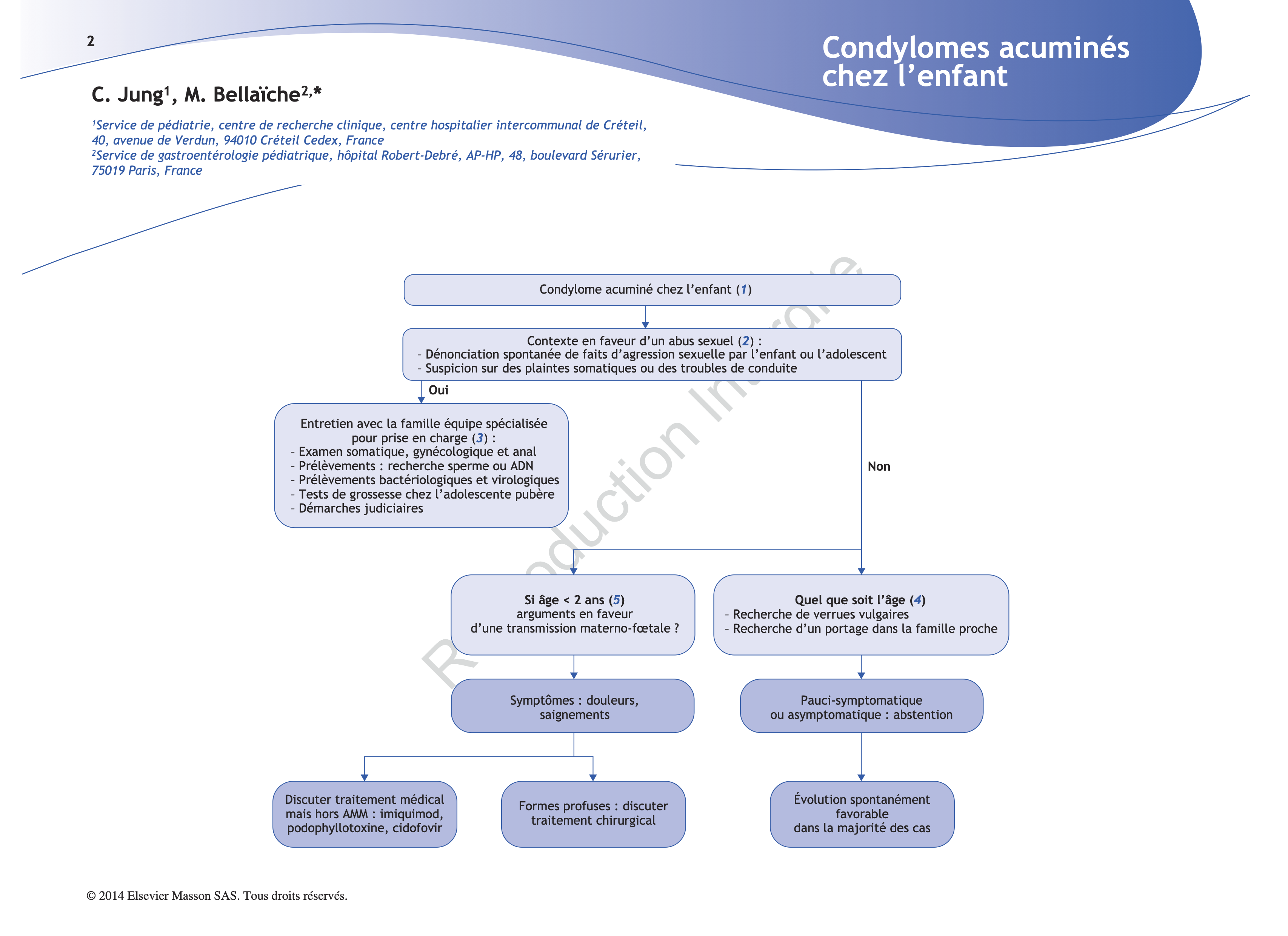 De par le mode de transmission de l’HPV chez l’adulte, les condylomes acuminés sont considérés comme des maladies sexuellement transmissibles et peuvent faire évoquer une agression sexuelle chez l’enfant ou l’adolescent. Néanmoins, il est maintenant estimé que la fréquence des contaminations sexuelles par HPV lors des situations d’agression sexuelle est de moins de 10 %.