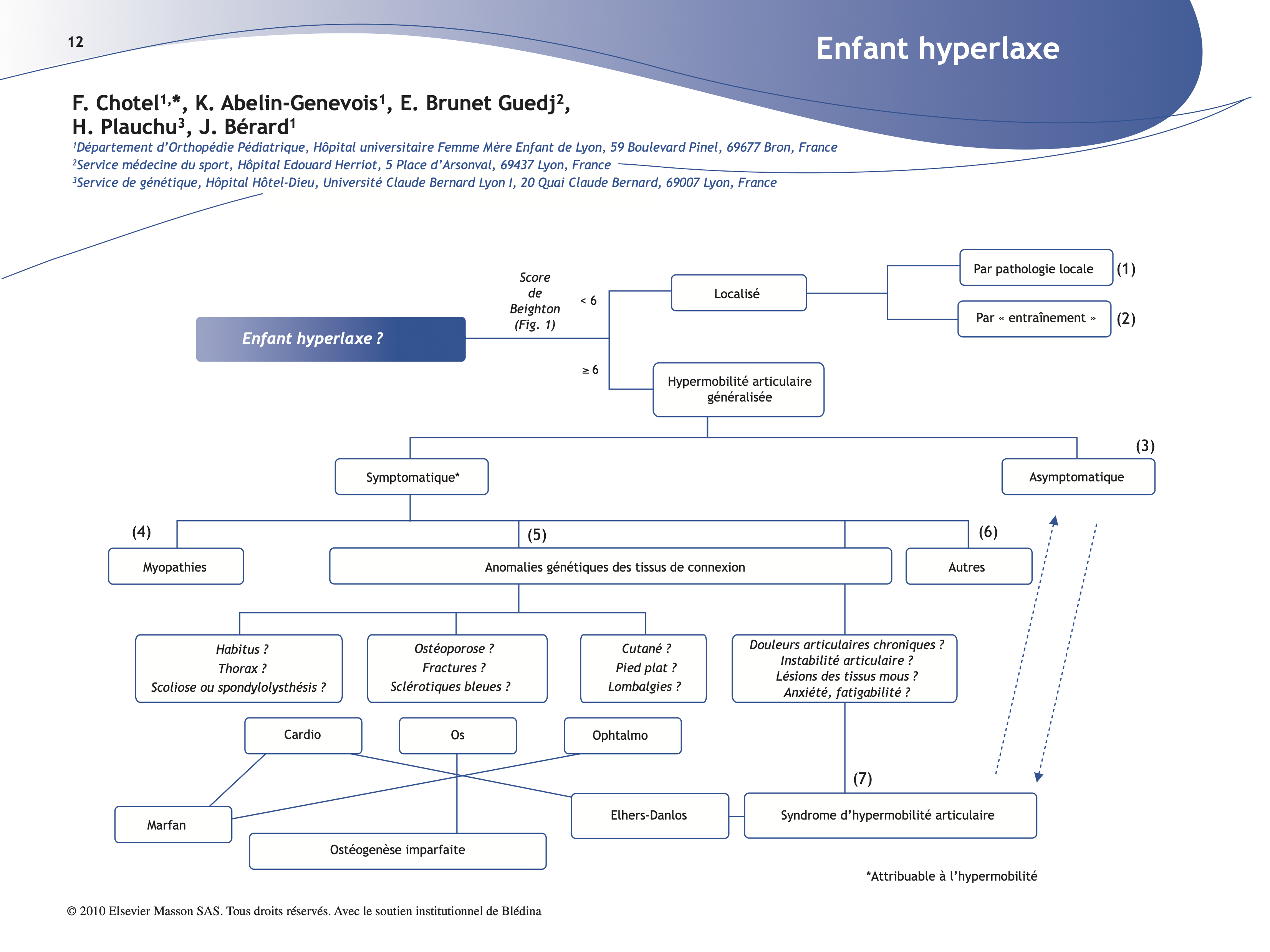 1Département d’Orthopédie Pédiatrique, Hôpital universitaire Femme Mère Enfant de Lyon, 59 Boulevard Pinel, 69677 Bron, France ; 2Service médecine du sport, Hôpital Edouard Herriot, 5 Place d’Arsonval, 69437 Lyon, France ; 3Service de génétique, Hôpital Hôtel-Dieu, Université Claude Bernard Lyon I, 20 Quai Claude Bernard, 69007 Lyon, France