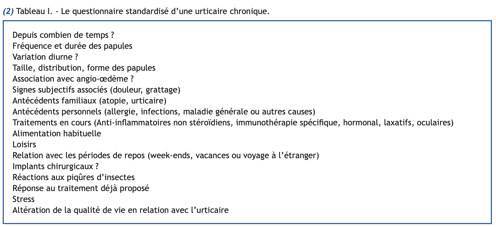L’interrogatoire et l’examen clinique sont des éléments importants du diagnostic d’une urticaire chronique. L’interrogatoire standardisé doit inclure les items décrits dans le tableau I.