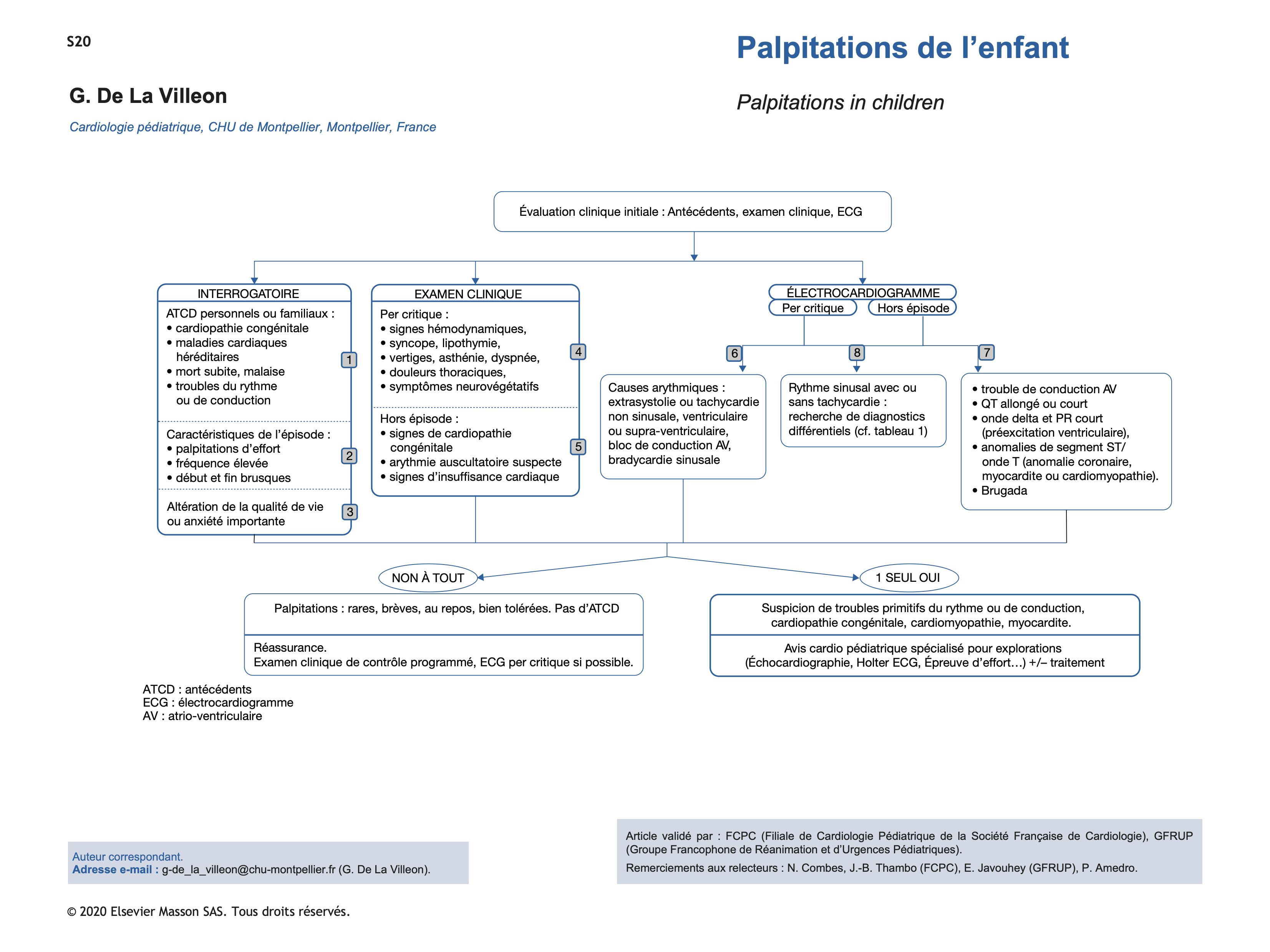 (4) Une mauvaise tolérance de l’épisode est un critère de gravité et nécessite un diagnostic étiologique rapide, surtout en cas de signes d’altération hémodynamique avec perte de connaissance, ce qui est exceptionnel. L’existence de symptômes tels que pâleur et douleur thoracique associés aux palpitations suggère une cause organique. La dyspnée, les pleurs soudains ou le calme inhabituel avec interruption de l’activité chez les plus jeunes enfants sont également à rechercher.