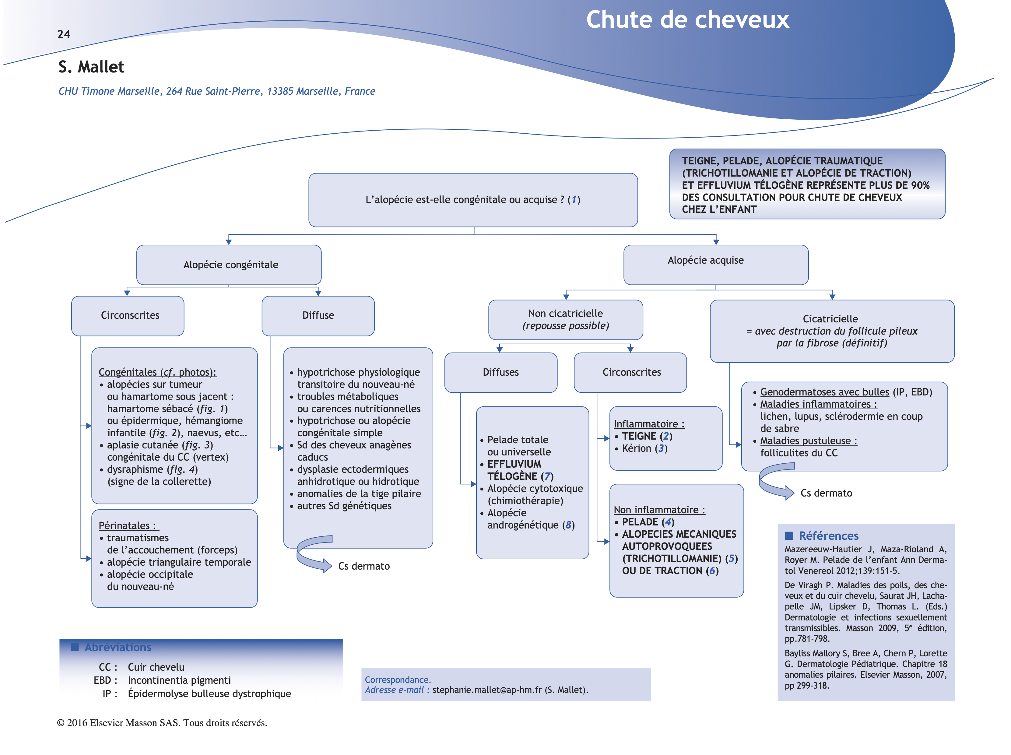 (7) L’effluvium télogène est une chute de cheveux clairsemée et diffuse acquise due au passage prématuré des cheveux de la phase anagène (phase de croissance) à la phase télogène (repos). À la traction (« pull test »), de nombreux cheveux tombent facilement. Elle survient 2 à 4 mois après un événement déclencheur stressant, comme une intervention chirurgicale, une forte fièvre, un accident ou un stress psychologique. Les causes à éliminer sont une anémie ferriprive, une dysthyroïdie, un régime très restrictif ainsi que certains médicaments. La chute peut être impressionnante, mais il faut rassurer les patients car la repousse est constante en 6 mois. En l’absence de cause évidente le bilan proposé contiendra NFS, ferritinémie et TSH.