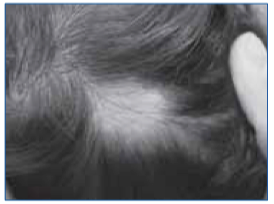(6) L’alopécie de traction survient lors de coiffure, comme les queues de cheval, chignons et nattes serrées. Le traitement consiste simplement à supprimer la cause. La repousse peut prendre 6 à 12 mois. Mais l’alopécie peut devenir permanente si la traction est répétée ou prolongée.