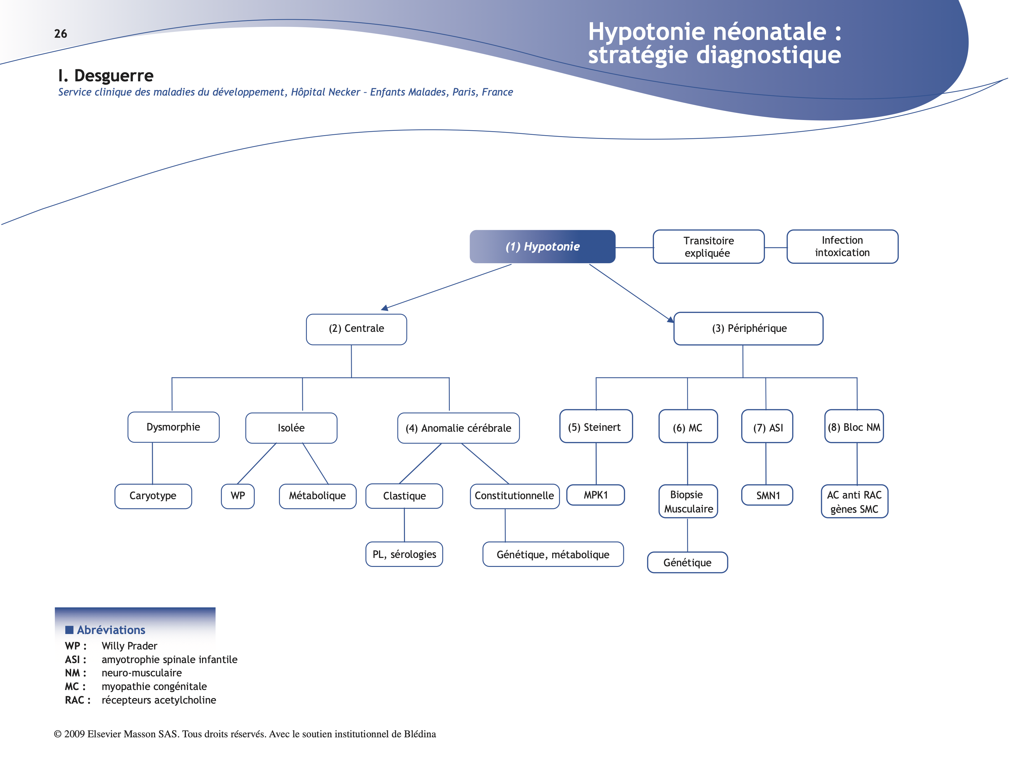(3) Une atteinte dite périphérique est évoquée lors : (a) d’une hypotonie paralytique (motricité spontanée et provoquée très faible, absence de mouvements en dehors du plan du lit) ; (b) de déformations orthopédiques ; (c) d’une amimie et/ou une ophtalmoplégie et d’un ptosis ; (d) de l’abolition des réflexes ostéotendineux, de la présence de fasciculations linguales en faveur d’une atteinte de la corne antérieure ; (e) d’une détresse respiratoire ou d’une absence d’autonomie respiratoire (hypomobilité thoracique en faveur d’une paralysie du diaphragme et des intercostaux, respiration paradoxale en faveur d’une atteinte isolée des intercostaux avec respect du diaphragme).