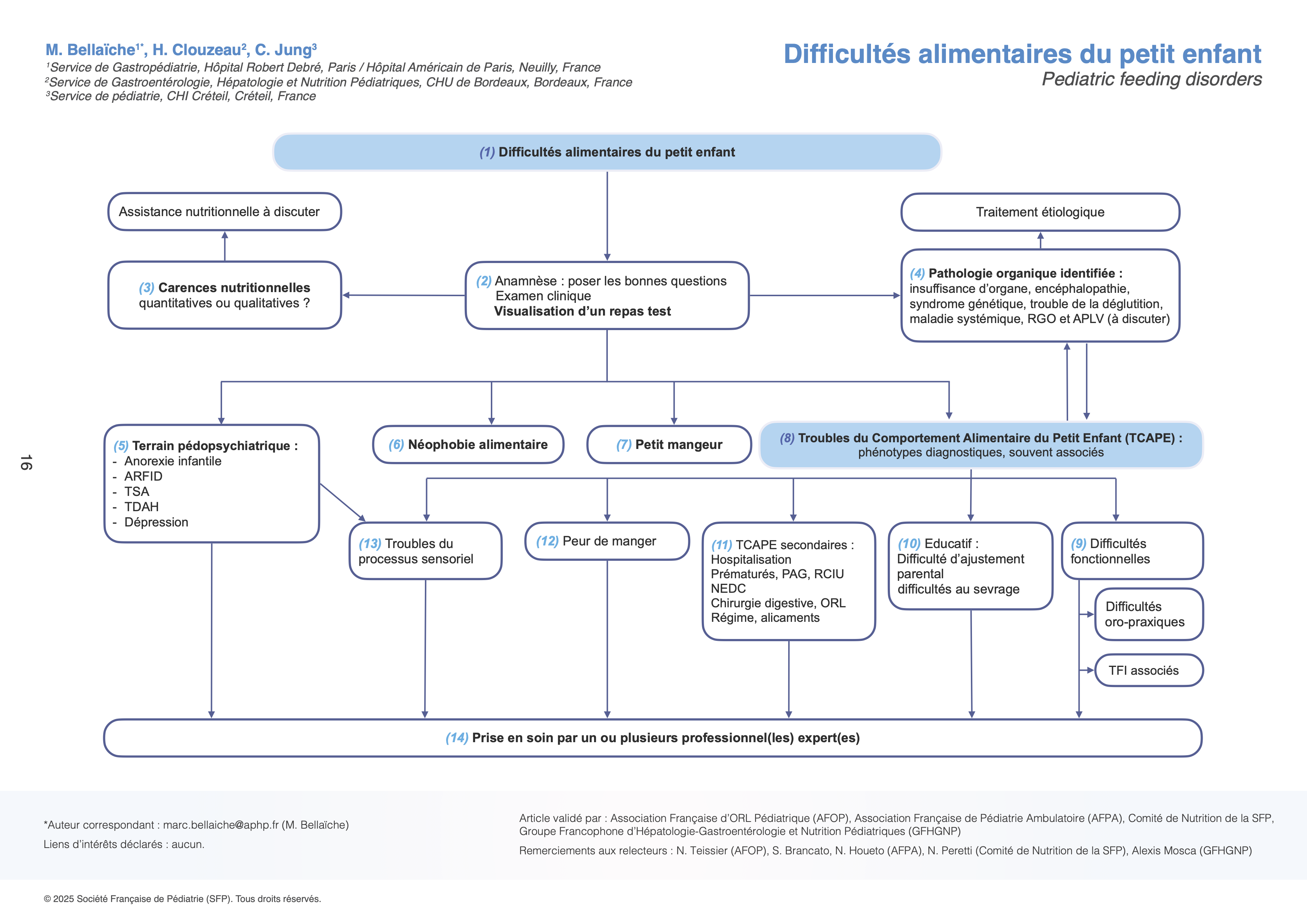 Dans cet algorithme, il est question de difficultés d’alimentation puisqu’il s’agit du symptôme allégué par les parents. Nous distinguerons l’enfant qui ne peut pas manger, celui qui ne veut pas manger, celui qui n’a pas « besoin » de manger, celui qui ne sait pas manger et celui qui ne mange pas comme ses parents aimeraient qu’il mange ! Le terme de « trouble de l’oralité » ou « dysoralité » a longtemps été utilisé mais ce terme n’a pas de définition précise, ni d’existence dans la littérature internationale, et renvoie à des concepts flous. « Manger n’est pas qu’une histoire de bouche » !
