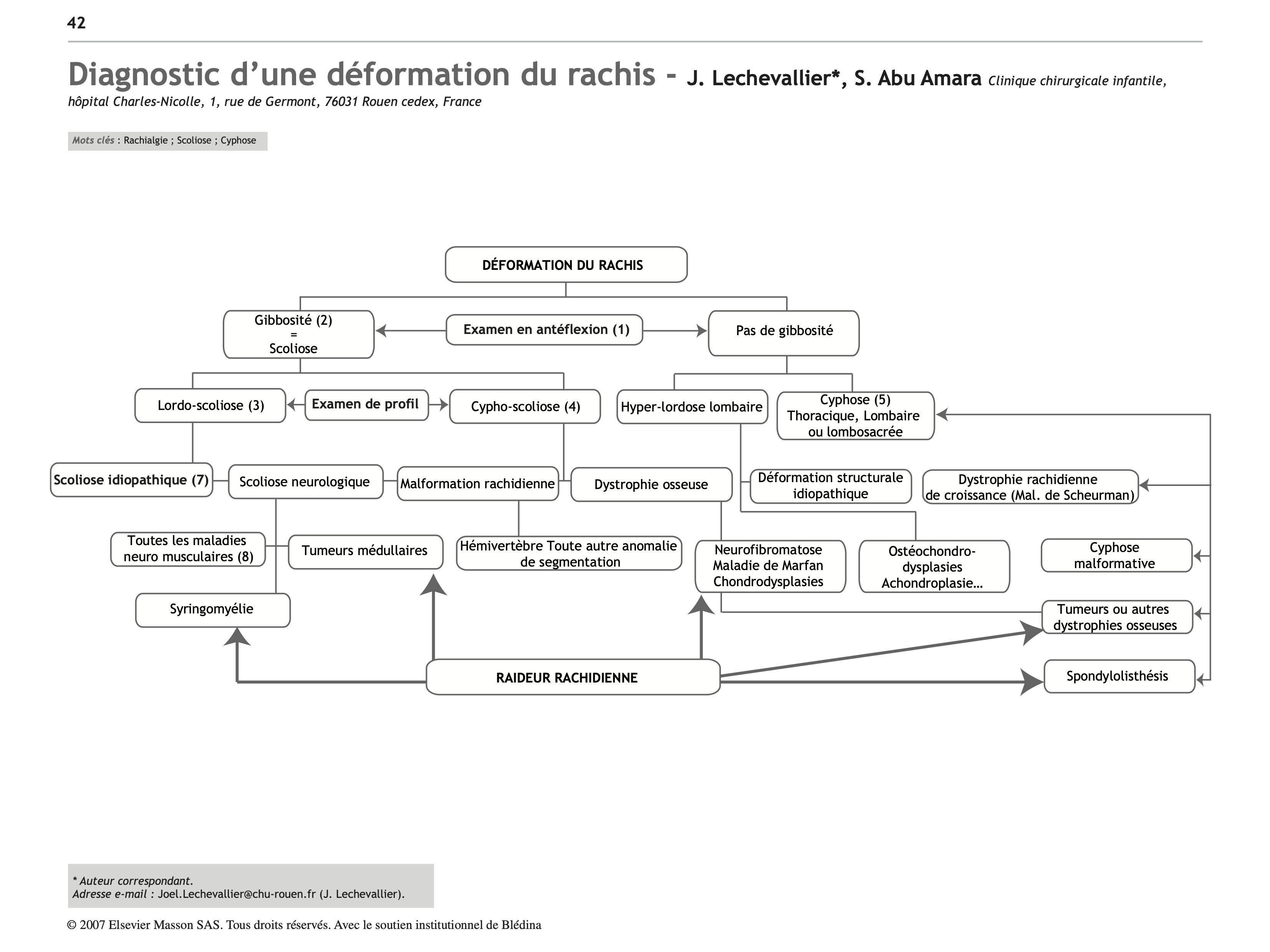 (7) Scoliose idiopathique : c’est la cause la plus fréquente de consultation déformation rachidienne. Son diagnostic repose sur la gibbosité témoin de la rotation vertébrale, le dos plat, voire creux, et l’absence de signe neurologique ou radiologique.