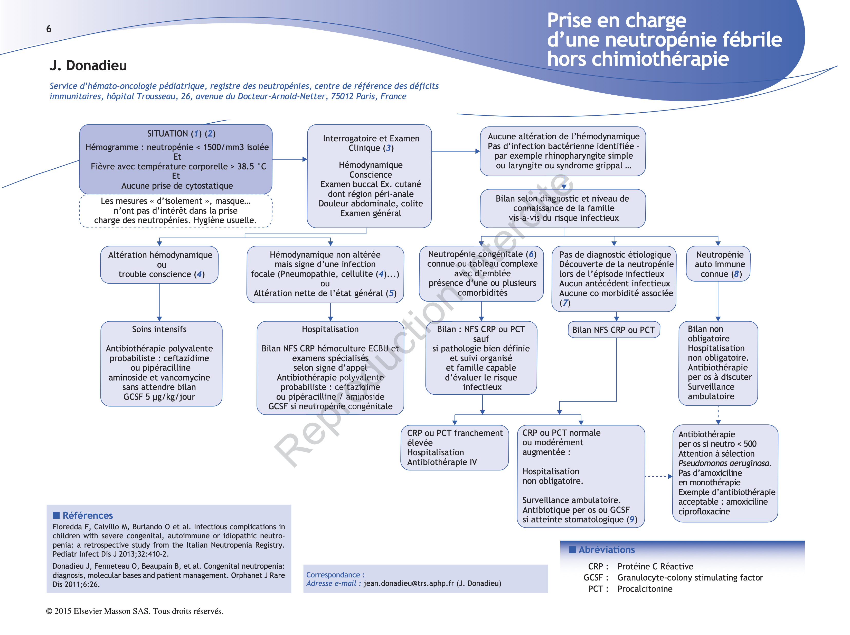 (7) Ce pas à pas n’aborde pas la question du diagnostic d’une neutropénie. Si nécessaire, il est possible de consulter le pas à pas « diagnostic d’une neutropénie » (http://pap-pediatrie.com). Il est recommandé de se rapprocher d’un service d’hématologie pédiatrique pour le bilan d’une neutropénie sévère, mais aussi pour discuter de la prise en charge thérapeutique au long cours, qui visera à prévenir des infections sévères et une gingivo-stomatite soit par une antibiothérapie prophylactique, soit par des injections de G-CSF.