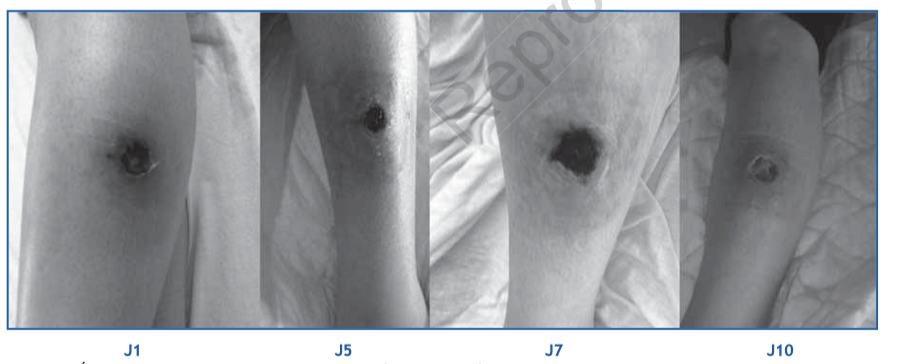 (4) La cellulite est infection d’un tissu sous cutanée. Ce type de lésion est caractérisé par une inflammation locale douloureuse, sans apparition de pus. L’évolution (Fig. 1) est caractérisée par une nécrose locale et une lente cicatrisation.