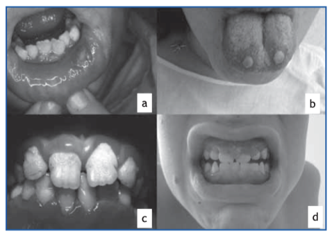 (9) L’atteinte stomatologique est soit très fréquente et très multiforme chez le patient neutropénique, soit aiguë sous forme d’aphtes sur la lèvre (Fig. 2a) ou la langue (Fig. 2b). Les lésions peuvent être chroniques avec une parondotopathie inflammatoire chronique (Fig. 2c) entraînant des altérations majeures de l’émail dentaire, ou être hypertrophique (Fig. 2d). Ces lésions sont liées toutes à un défaut de cicatrisation plutôt qu’à une infection aiguë et le seul traitement efficace n’est pas une antibiothérapie, ni un antiviral dans l’hypothèse d’un herpès, mais le GCSF.