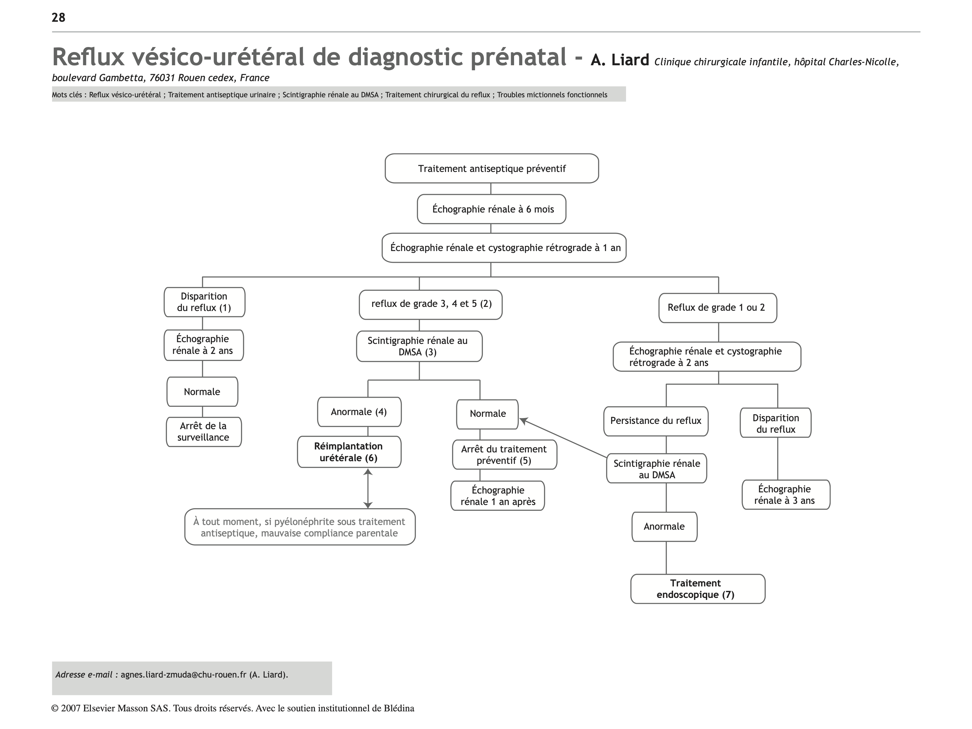 (4) La présence de lésions rénales en scintigraphie (ou d’une hypoplasie rénale en échographie) est corrélée avec la non guérison du reflux au cours de la croissance. Par contre, une scintigraphie rénale normale sans cicatrice et avec une fonction rénale différentielle symétrique est corrélée avec la disparition du reflux au cours de la croissance.