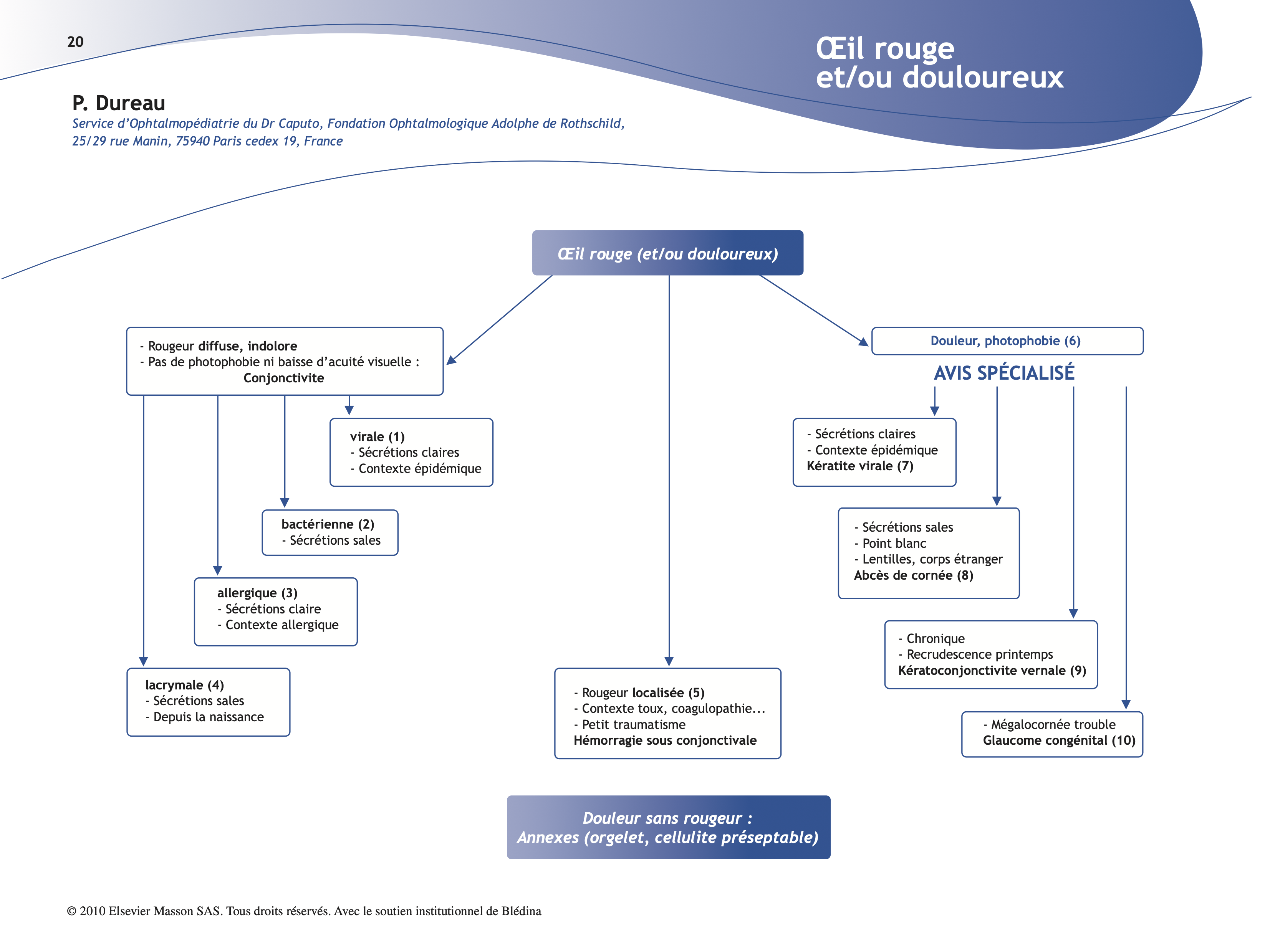(6) La rougeur avec douleur et photophobie correspond généralement à une kératite. Elle nécessite un avis spécialisé. L’examen est plus facile après instillation d’une goutte d’anesthésique local (dont la prescription est interdite).