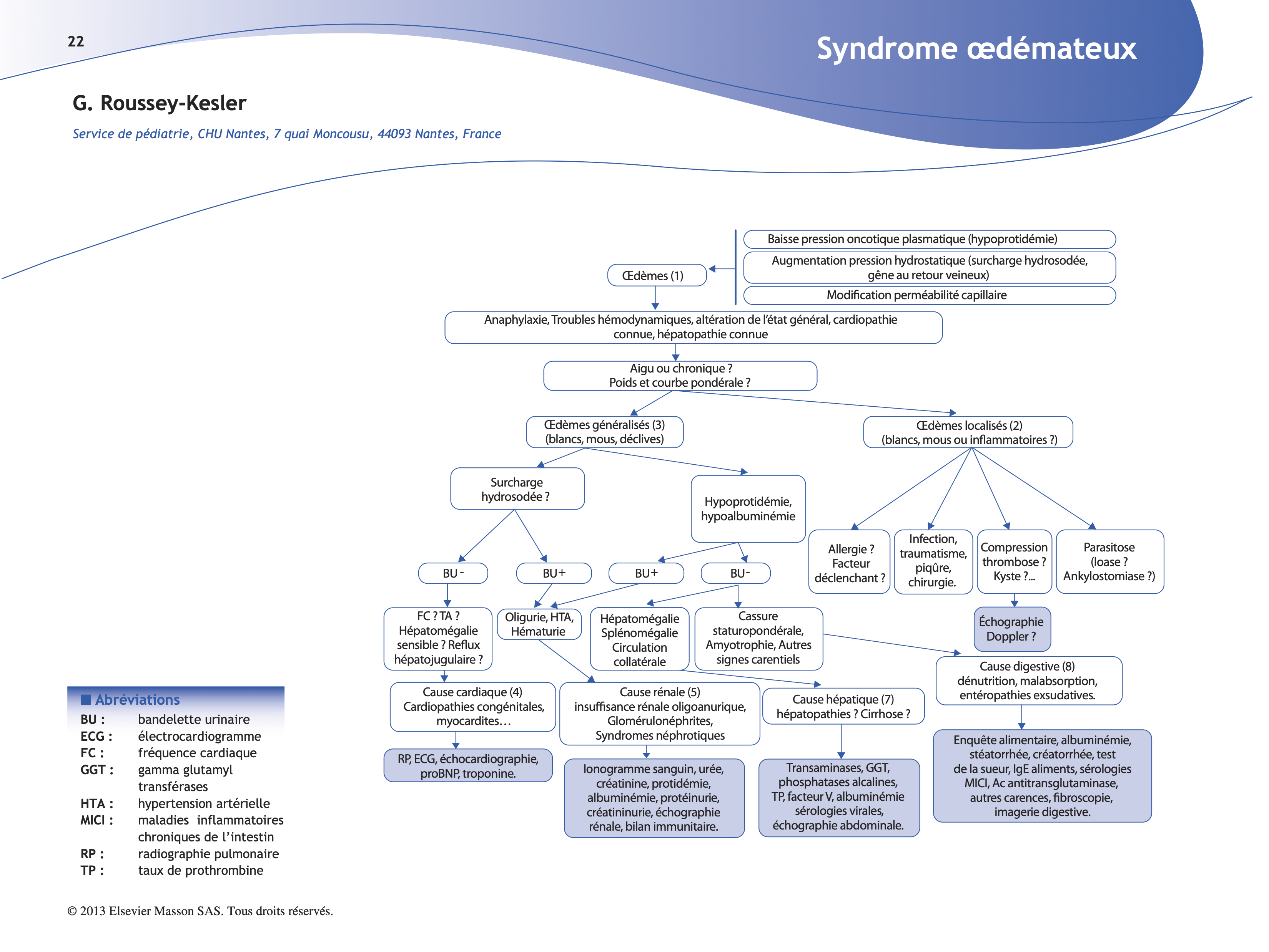 (1) Le syndrome œdémateux correspond à une accumulation d’eau et de sel dans le secteur interstitiel. Les échanges entre les milieux interstitiel et vasculaire se font au travers des parois des endothéliums capillaires et résultent des pressions hydrostatique et oncotique au niveau capillaire et interstitiel [1]. L’arbre décisionnel illustre la démarche diagnostique, clinique et paraclinique devant un syndrome œdémateux de l’enfant. Les éléments qui doivent être recherchés à l’examen clinique sont indiqués en italique, les examens complémentaires en grisés, et sont réalisés selon l’orientation étiologique clinique.