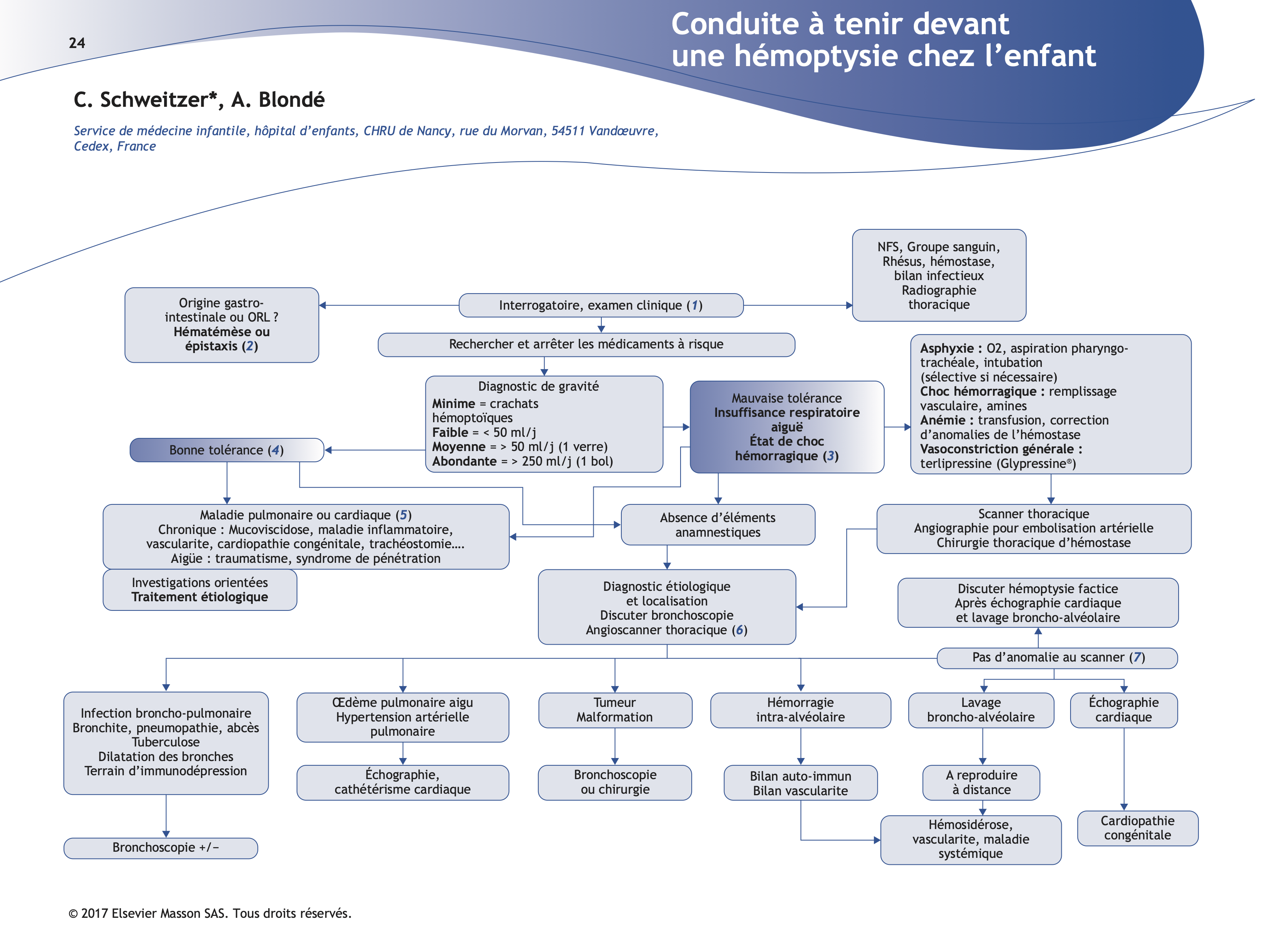 (3) Les hémoptysies sont rarement une urgence vitale chez l’enfant mais le diagnostic de gravité conditionne la prise en charge. En cas de saignement massif engageant le pronostic vital par inondation des voies aériennes, une assistance respiratoire invasive doit être mise en oeuvre rapidement. En cas d’origine unilatérale du saignement, une intubation sélective permet de protéger le poumon sain. Le pronostic vital peut aussi être engagé suite à un état de choc hémorragique. Le diagnostic étiologique doit ensuite être abordé une fois le patient stabilisé.