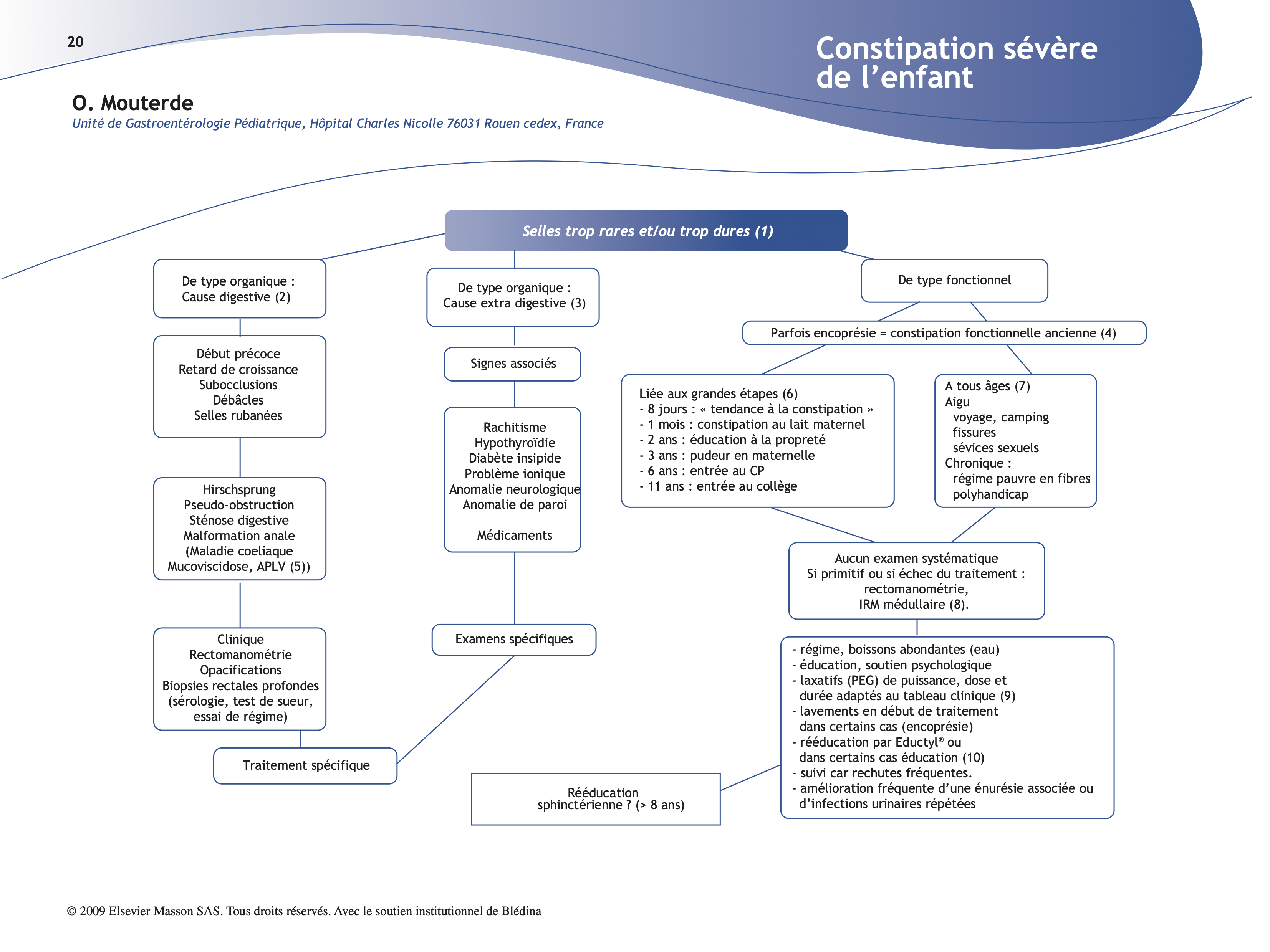 (3) Il est exceptionnel que le diagnostic de telles pathologies soit fait à partir de la seule constipation. Il existe en général un contexte symptomatique ou thérapeutique évocateur. Dans les problèmes ioniques, on peut trouver : hypercalcémie, hypomagnésémie, hypokaliémie. Dans les anomalies neurologiques, il faut entendre toute pathologie perturbant le fonctionnement de la défécation, comme le spina-bifida, l’agénésie sacrée, les neuropathies périphériques. L’enfant polyhandicapé est par ailleurs sujet à la constipation fonctionnelle : absence d’activité physique, manque de fibres, faiblesse de l’effort de poussée, non réponse aux stimuli rectaux…