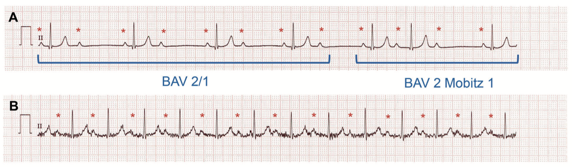 A : bloc auriculoventriculaire (BAV) type 2. Le BAV est 2/1 sur les 4 premiers battements avec 1 onde P (*) sur 2 conduite. Sur les battements suivants, le PR s’allonge progressivement jusqu’à ce qu’une onde P soit bloquée (BAV 2 Mobitz 1).