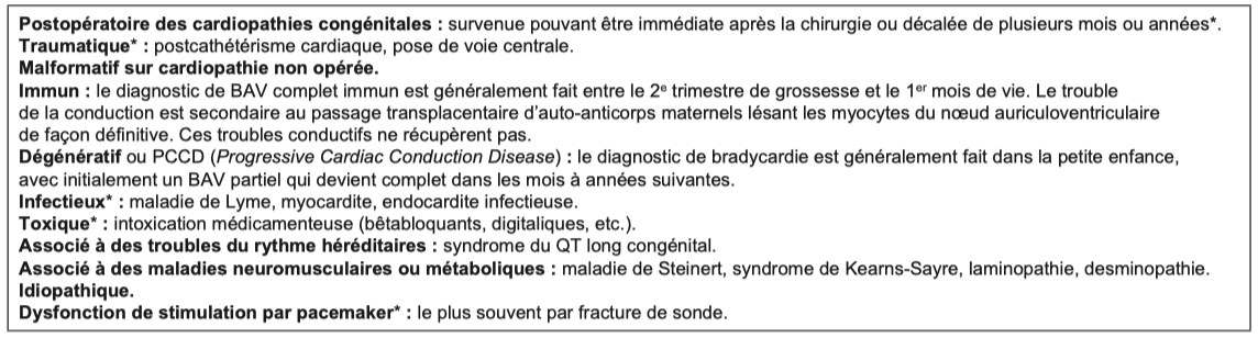 Les étiologies suivies d’un * sont des causes d’apparition brutale de BAV, potentiellement responsable d’une insuffisance circulatoire.