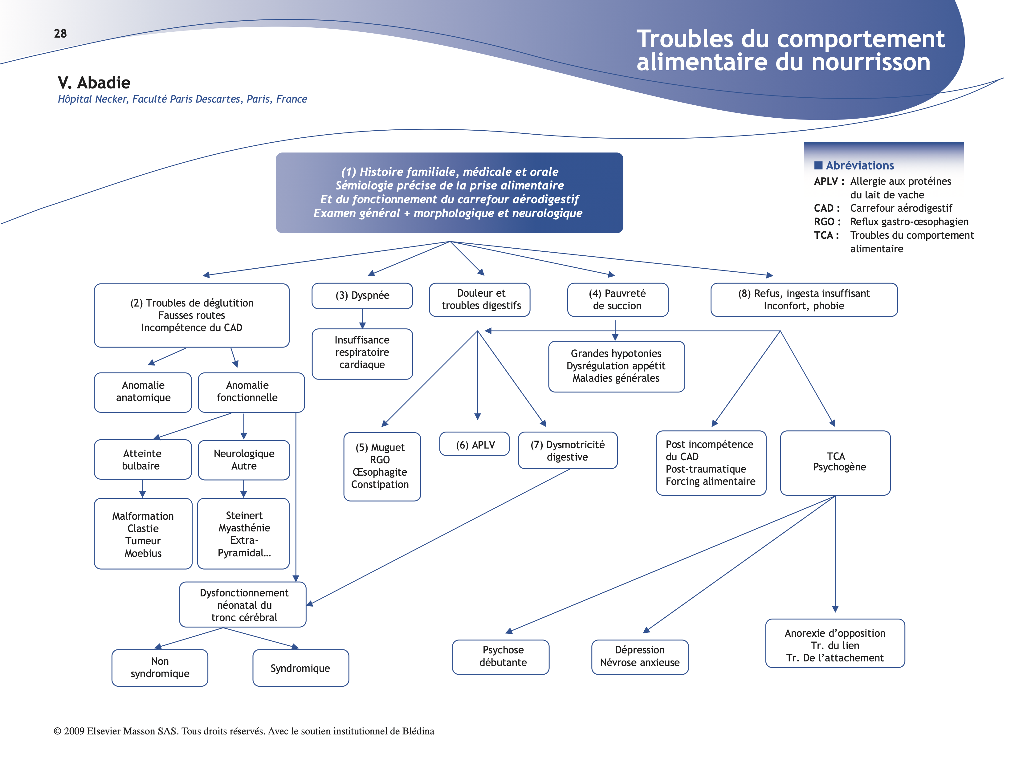 (2) La première question à se poser devant un TCA est de savoir s’il existe ou non une incompétence du carrefour aérodigestif. Si la clinique est en faveur (fausses routes, stridor, bruit pharyngolaryngé, pneumopathie), il faut demander une fibroscopie complète pour différencier les anomalies anatomiques (kystes, angiomes, diastème, fistule) des anomalies fonctionnelles du carrefour aérodigestif (CAD). En cas d’anomalies fonctionnelles, l’examen neurologique de toutes les paires crâniennes et de toutes les fonctions sensorimotrices et neuromusculaires, associé à la réalisation d’une manométrie de l’œsophage, va permettre de différencier trois cas de figure. Dans le premier, clinique et laryngoscopie sont en faveur d’une incompétence du CAD isolée ou tableau de dysfonctionnement néonatal du tronc cérébral (DNTC) sans autre anomalie à l’examen neurologique. La présence ou non d’éléments dysmorphiques et/ou malformatifs orientent alors vers un DNTC isolé ou vers un DNTC syndromique. Dans ce dernier cas, la présence ou non d’une fente palatine postérieure oriente vers le champ des séquences de Pierre Robin (isolée, syndromiques ou associées) ou vers celui des DNTC (syndromique : Del 22 q11, CHARGE, Kabuki …. ou associé). S’il existe une anomalie des nerfs crâniens ou des signes d’atteinte de la fosse postérieure, une IRM cérébrale s’impose pour éliminer les anomalies malformatives, acquises ou clastiques de la fosse postérieure. Si cette dysfonction du carrefour aérodigestif s’accompagne de signes neuromusculaires (hypotonie, fatigabilité, syndrome extrapyramidal…), il faut évoquer des anomalies neurologiques ou neuromusculaires congénitales qui se révèlent par des symptômes trompeurs (myotonie de Steinert, myasténie congénitale, atteinte des noyaux gris centraux d’origine métabolique …) et demander les examens spécifiques (EMG, biologie moléculaire).