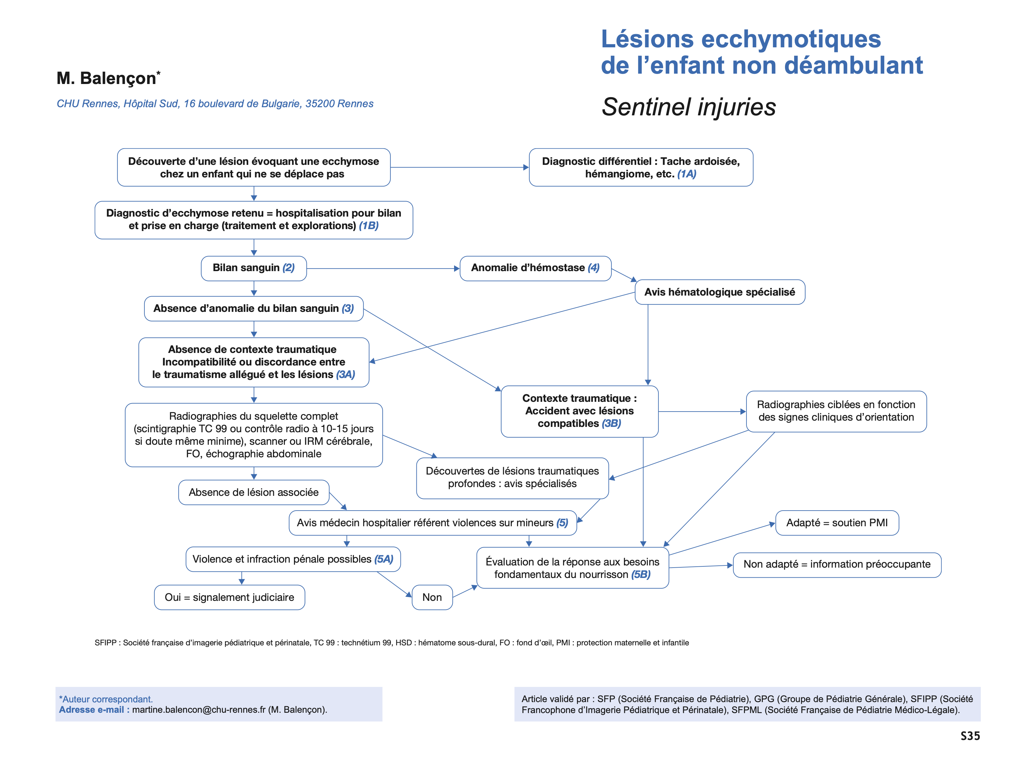 (1B) Lorsque le diagnostic d’ecchymose est retenu, la question du danger imminent doit être immédiatement présente à l’esprit du praticien et des équipes de soins. Dans ces circonstances, il est incontournable d’organiser en urgence un temps d’hospitalisation en milieu pédiatrique afin de pouvoir réaliser des explorations complémentaires, prendre soin de l’enfant en se centrant sur sa santé et assurer un espace de protection thérapeutique dans un contexte d’urgence médicale.