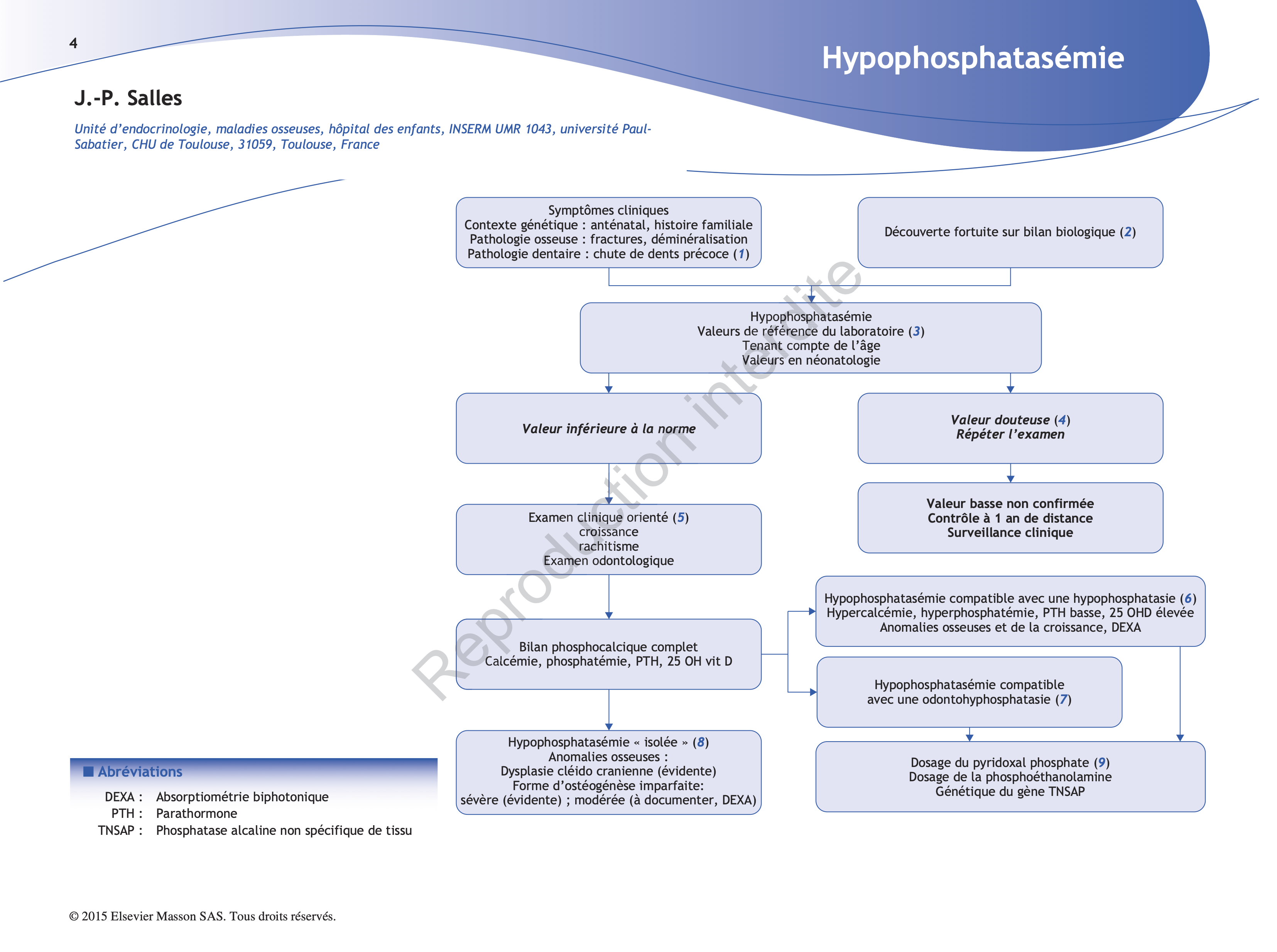 (9) Si une forme d’HPP est suspectée, on peut s’aider du dosage d’autres substrats de l’enzyme qui s’accumulent dans le plasma ou l’urine. Il s’agit du phosphate de pyridoxal (vitamine B6) dans le plasma ou de la phospho-étanolamine dans l’urine. Cependant ces dosages ne sont pas communément réalisés et les normes peu disponibles, dans des laboratoires très spécialisés. Le diagnostic génétique d’HPP peut être aisément réalisé, mettant en évidence des mutations homozygotes ou hétérozygotes composites. Plus rarement, il s’agit de formes hétérozygotes simples produisant des dominants négatifs, comme dans l’odontohypophosphatasie. Ceci souligne l’importance de l’enquête génétique. Les formes prénatales et périnatales peuvent être suspectées lors de la surveillance échographique (défaut de minéralisation surtout crânienne, anomalies métaphysaires avec spicules, déformations osseuses). Le diagnostic génétique anténatal n’est le plus souvent pas réalisé. Un dosage de PA est alors réalisé après la naissance. Les données disponibles sur les valeurs normales de PA postnatale sont parcellaires. Le dosage devra être réalisé plusieurs fois dans les semaines après la naissance. Le diagnostic différentiel avec une OI (notamment le type V) est important car les biphosphonates sont contre-indiqués dans l’HPP. Le dosage du PLP et l’analyse génétique sont alors très contributifs.