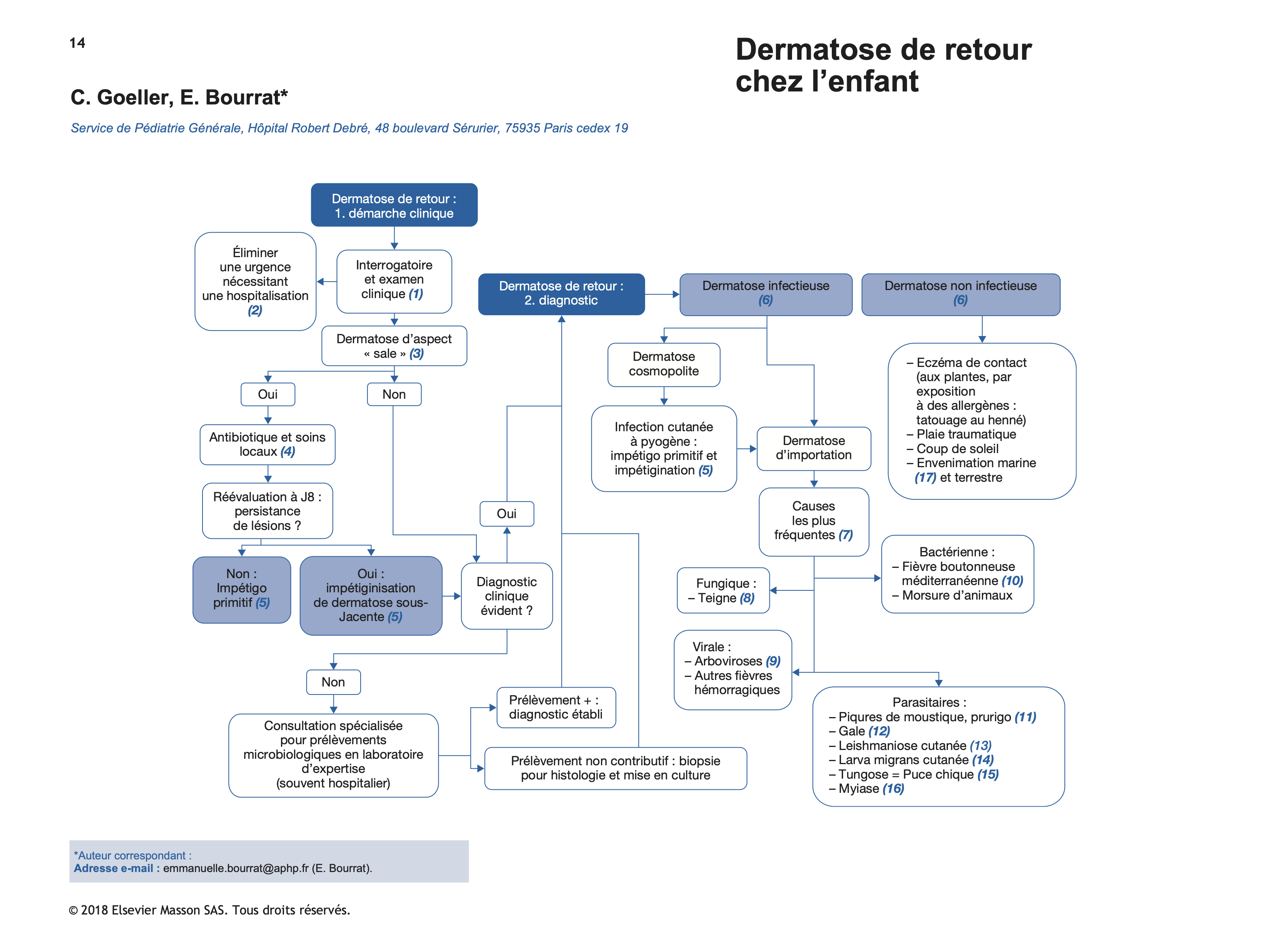 (6) Les dermatoses sont le 3e motif de consultation pédiatrique au décours d’un voyage. Ces dermatoses sont majoritairement infectieuses, l’effet anti-inflammatoire du soleil permettant une rémission des dermatoses inflammatoires.