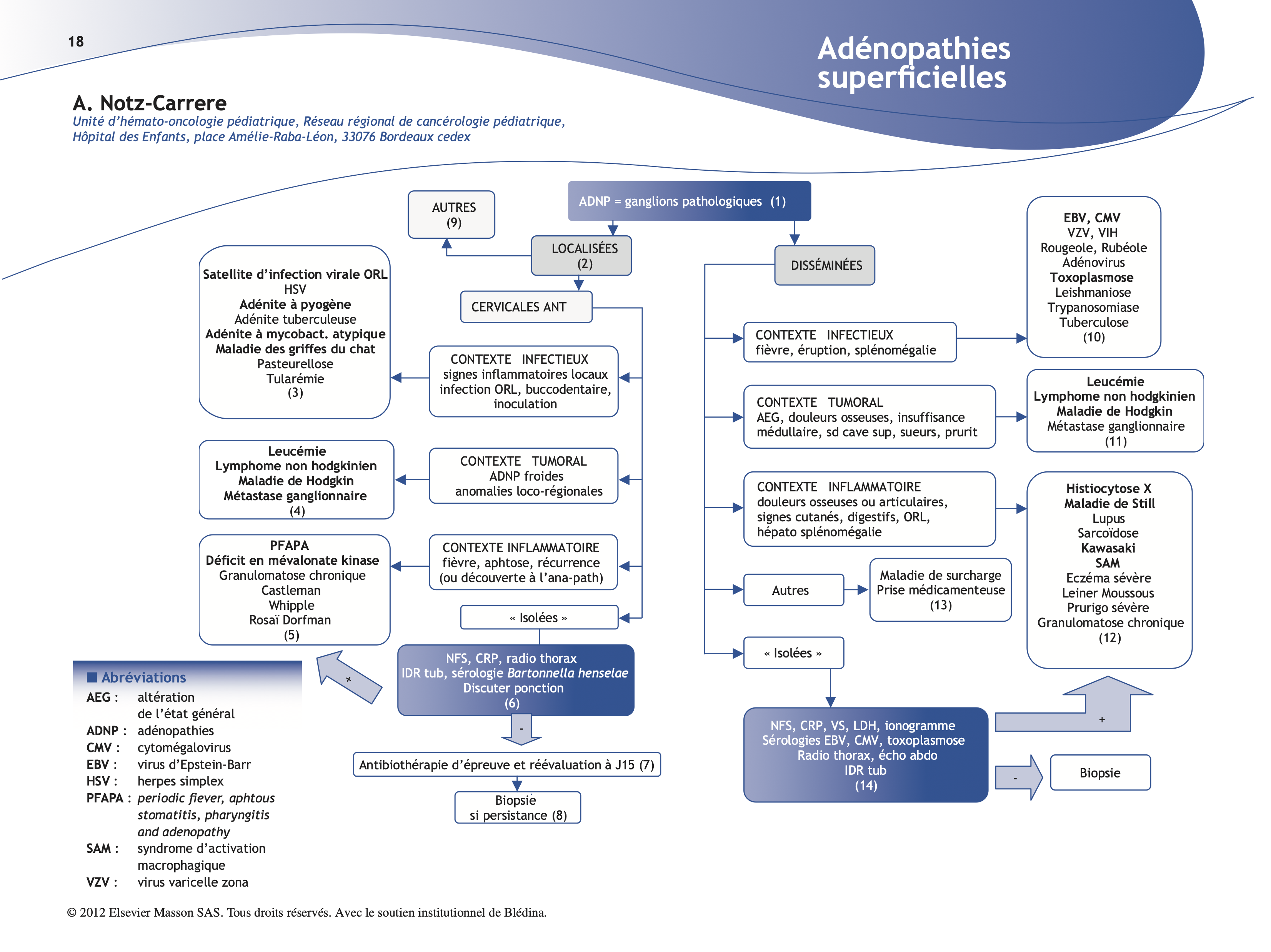 (11) Devant des ADNP généralisées les hémopathies doivent être recherchées car il s’agit d’urgences : bilan minimal (NFS, radio du thorax, échographie abdominale) ou contact avec un milieu pédiatrique spécialisé.