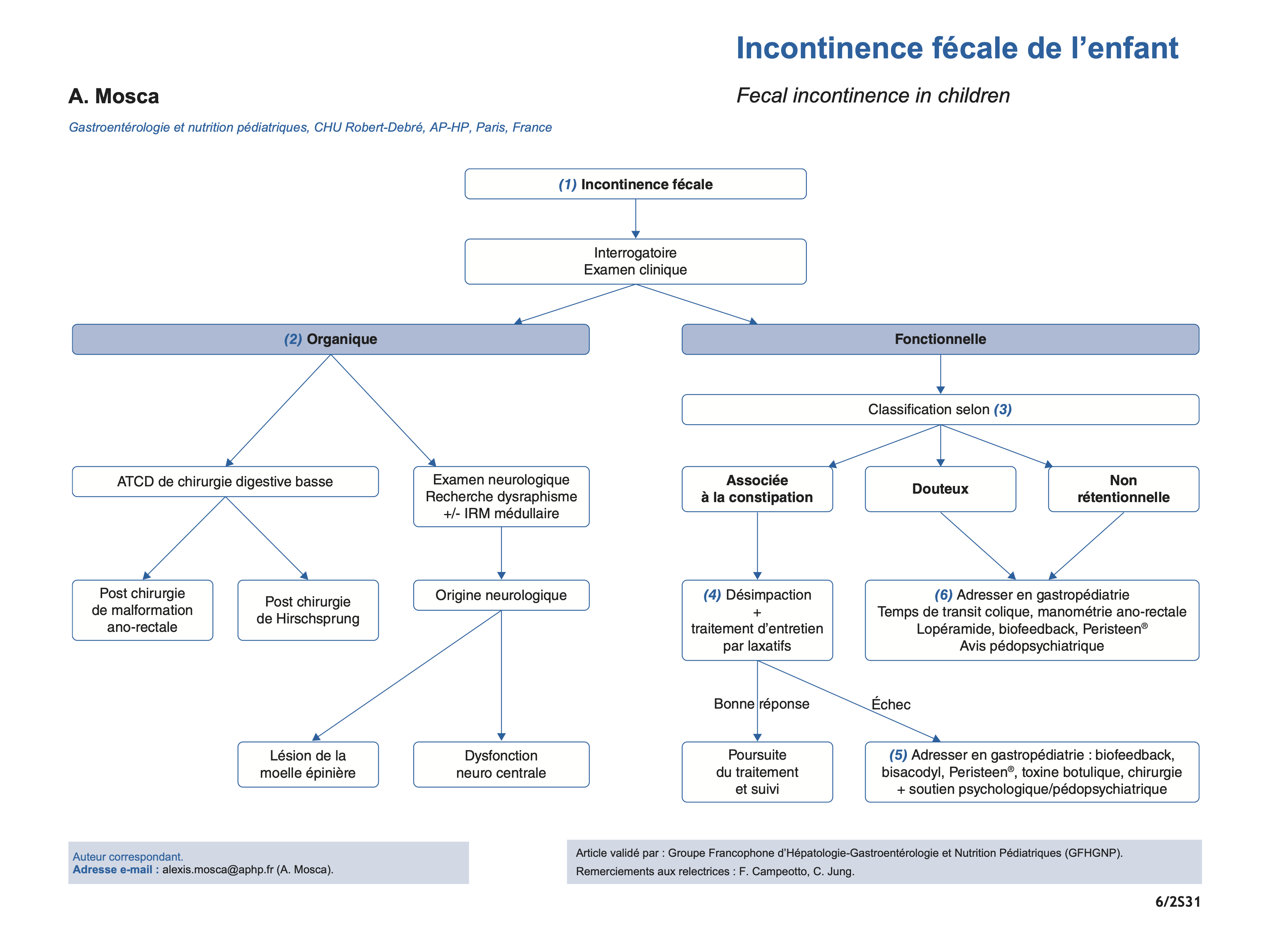 L’IF est une pathologie ayant un fort retentissement sur la qualité de vie de l’enfant. Des solutions simples incluant le traitement de la constipation et la rééducation des habitus permettent de résoudre ce problème invalidant dans la majorité des cas. En cas d’échec, une consultation spécialisée en gastropédiatrie est indispensable pour réaliser une manométrie ano-rectale et orienter la prise en charge, en particulier avec le biofeedback.