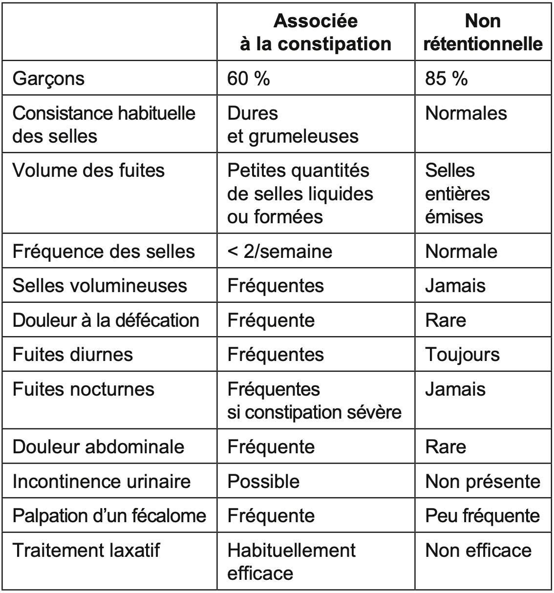 (3) L’IF fonctionnelle est soit associée à une constipation (dans plus de 80 % des cas), soit non rétentionnelle. Pour les différencier, on peut s’appuyer sur plusieurs critères cliniques (cf. tableau 1).