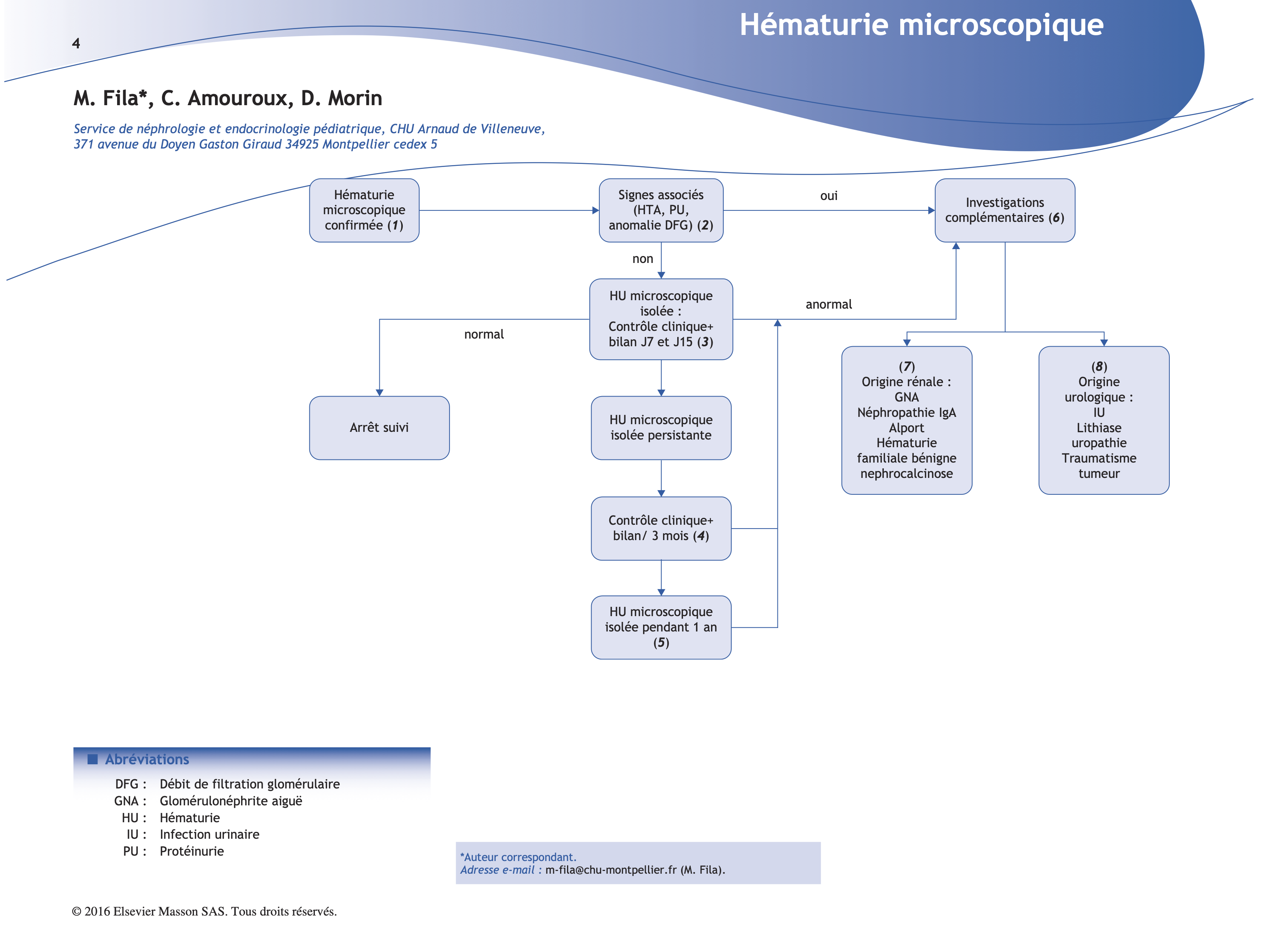 (4) En cas d’hématurie microscopique isolée persistante, un bilan trimestriel est à réaliser comportant une mesure de protéinurie, micro-albuminurie, cytologie urinaire et un examen clinique avec mesure de la pression artérielle. Une échographie rénale et vésicale et une mesure du rapport calcium/créatinine urinaire seront également réalisées. En l’absence d’étio- logie retrouvée, une étude de la morphologie des hématies en microscopie de phase permet d’orienter vers l’origine de cette hématurie (présence d’acanthocytes >5 %, VGM moyen <60?, hématies dysmorphiques en faveur d’une origine néphrolo- gique). Des hématies à forme conservée et un VGM normal sont en faveur d’une origine urologique.) Devant l’apparition d’anomalies, un bilan exhaustif sera réalisé en fonction des points d’appel (6) .
