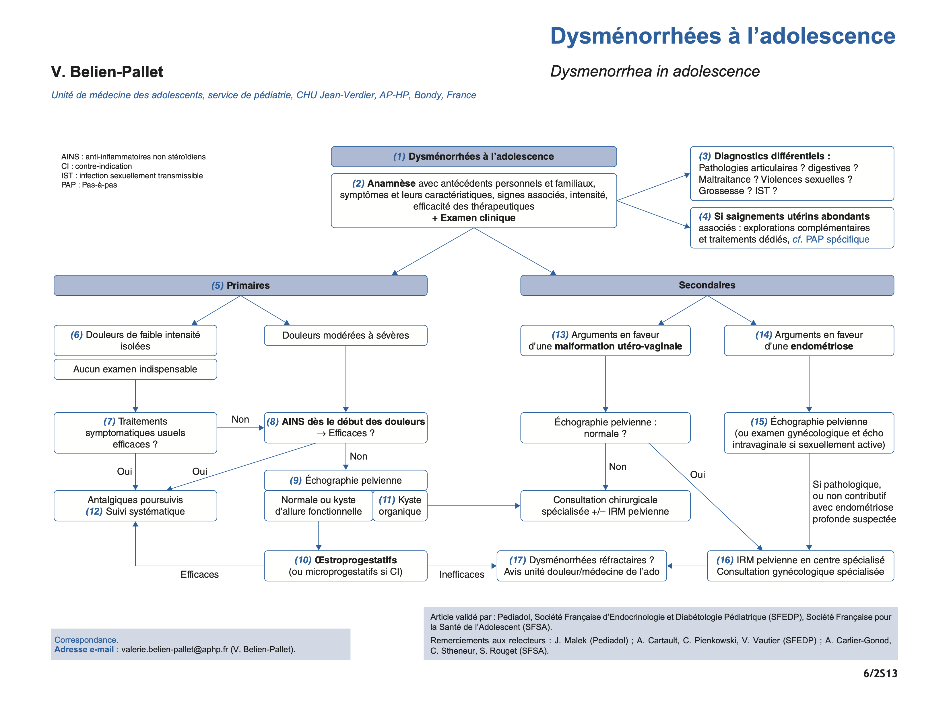 (13) Des dysménorrhées dès les premières menstruations doivent motiver la réalisation d’une échographie pelvienne et rénale, à la recherche d’une malformation utéro-vaginale (par exemple : utérus pseudo-unicorne, hémi-utérus, cloison vaginale, atrésie vaginale partielle) éventuellement associée à une malformation ou malposition rénale. Une orientation vers une consultation spécialisée en centre de référence gynécologique doit être proposée en cas d’anomalie confirmée.