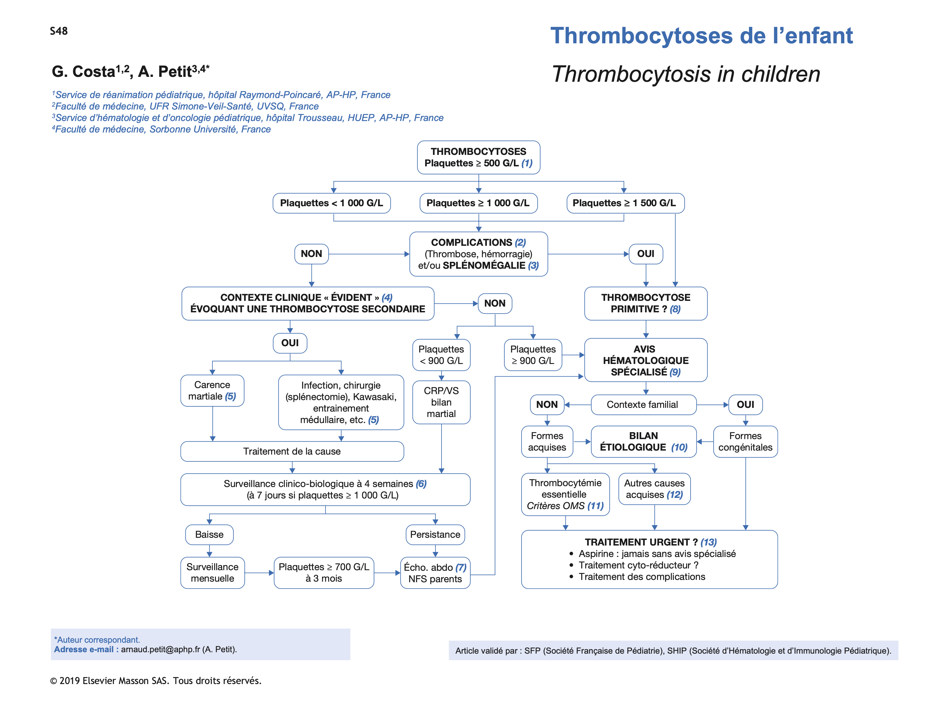 La thrombocytose est une situation fréquente en pédiatrie, définie par un taux de plaquettes >= 500G/L. Le plus souvent secondaire (ou réactionnelle) à une situation clinique facilement identifiable, la thrombocytose peut être primitive (il s’agit alors d’une maladie hématologique) et être révélée par une complication, ou risquer d’exposer l’enfant ou l’adolescent à une complication sévère. L’objectif de ce pas à pas est d’aider le pédiatre à identifier rapidement dans quel cadre nosologique se situe la thrombocytose et dans quelles circonstances un avis spécialisé est urgent.