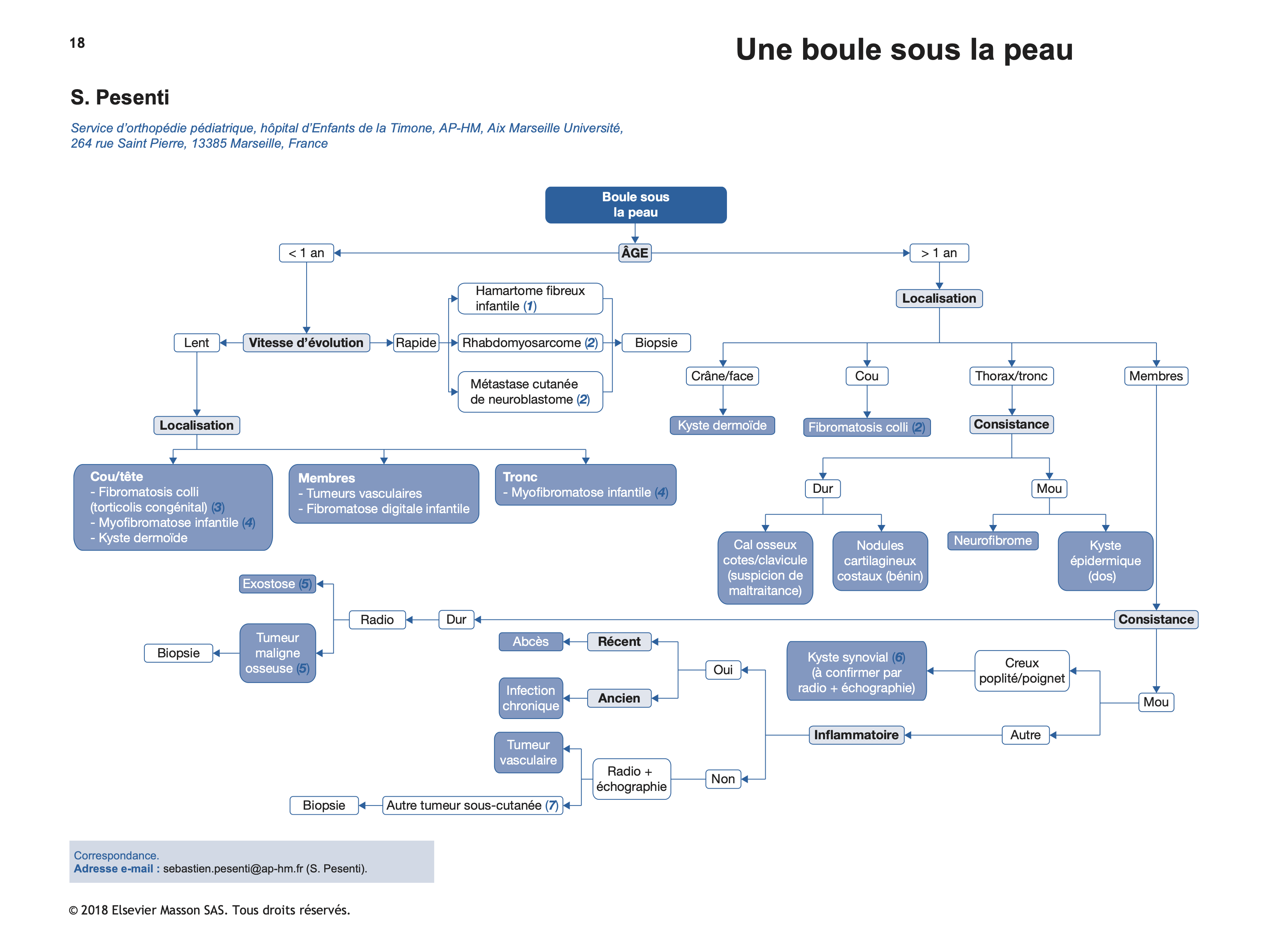 (7) Autres tumeurs sous-cutanées. Cette partie de l’arbre diagnostique regroupe toutes les autres formes de tumeurs souscutanées, bénignes ou malignes. Dans tous les cas, il faut proscrire l’échographie seule en première intention car elle peut mener à des errances diagnostiques. Au moindre doute, une lésion noncaractérisable cliniquement et en imagerie doit être biopsiée. La biopsie sera précédée d’une imagerie (échographie + radiographie ou IRM), souvent indispensable au diagnostic. La prise en charge diagnostique doit se faire dans un centre spécialisé du fait de la difficulté diagnostique que peuvent représenter certaines tumeurs. À noter qu’il existe un groupe d’anatomopathologie spécialisé dans le domaine des tumeurs des parties molles.