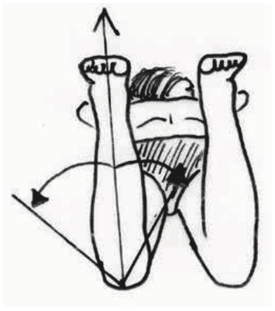 (3) Rotations interne et externe de hanche (fig. 2). Partant de la position jambe verticale : lorsqu’on fait tourner la jambe en dehors, on mesure la rotation interne de hanche ; tandis qu’en dedans on mesure la rotation externe.