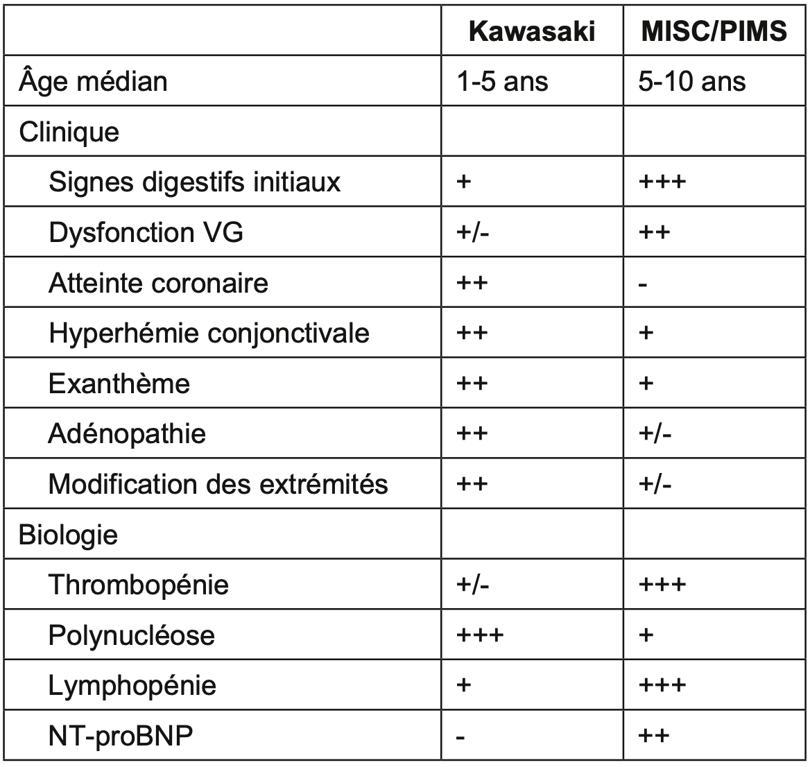 Dans le contexte de pandémie COVID-19, le diagnostic de syndrome inflammatoire multisystémique de l’enfant (MIS-C = Multisystem inflammatory syndrome in children ou PIMS = Paediatric inflammatory multisystem syndrome) peut également être évoqué chez un enfant fébrile ayant été exposé au SARS-CoV-2 dans les 4 à 6 semaines qui précèdent (Tableau 1). Il convient alors de réaliser un dosage du NT-ProBNP ou BNP et de la troponinémie. Une recherche d’expansion des lymphocytes T Vb21.3 peut être proposée (positive dans 75 % des cas).