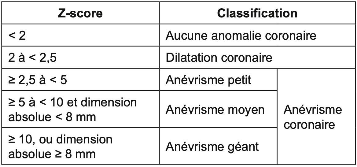 Les mesures des coronaires doivent être rapportées à la surface corporelle et exprimées sous forme de Z-score afin d’évaluer le risque coronaire initial et permettre une comparaison dans le temps. Les anévrismes coronaires sont les complications cardiaques les plus fréquentes. En l’absence de traitement, ils se constituent à la phase aiguë chez 15 à 25 % des enfants. Les anévrismes sont classés selon la mesure de leur diamètre interne en échocardiographie et normalisés selon le Z-score (qui exprime l’écart par rapport à la valeur moyenne normalisée, en déviation standard, selon la surface corporelle).